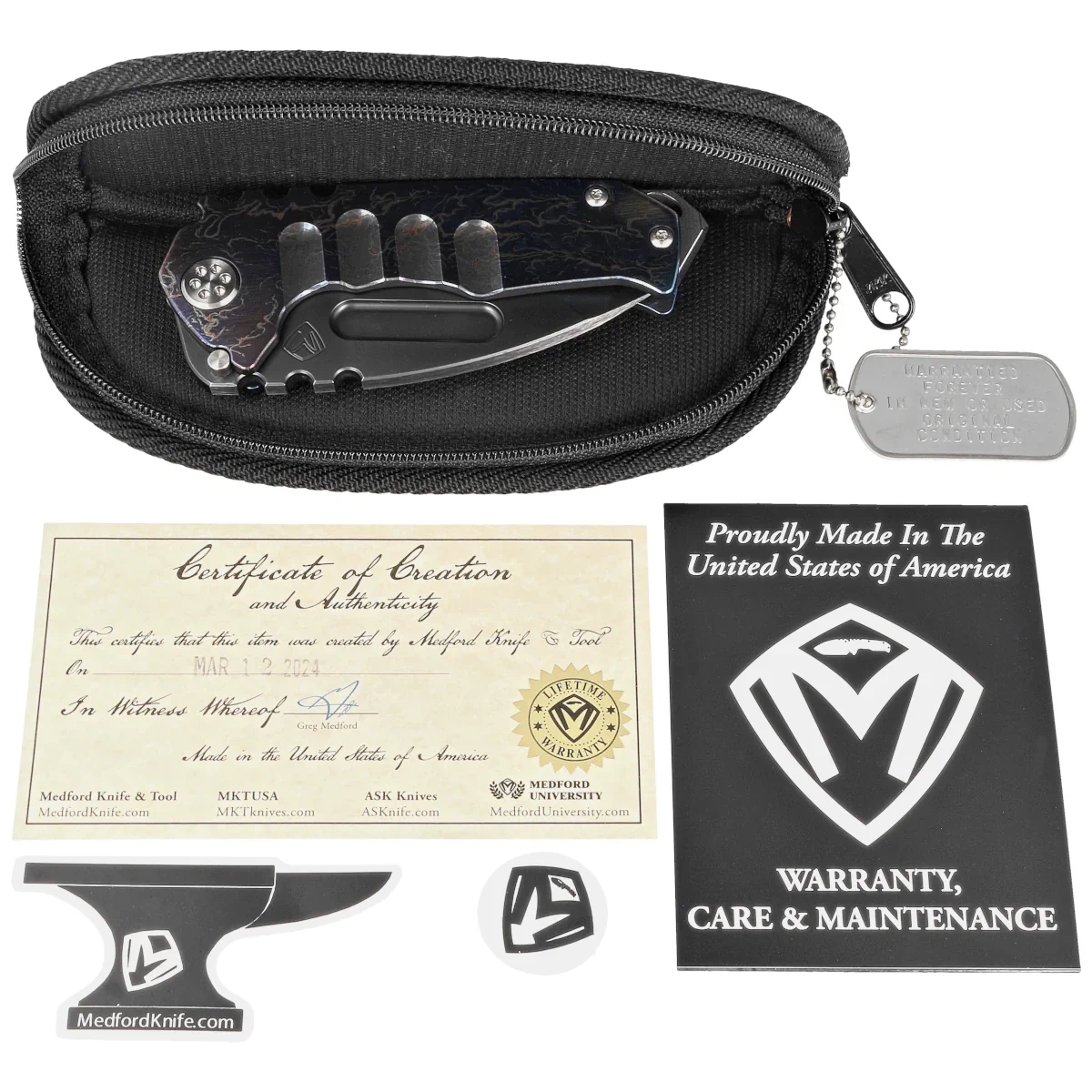 Included - cardboard packaging, nylon pouch, Dog Tag immortal and signed "Certificate of Creation and Authenticity".