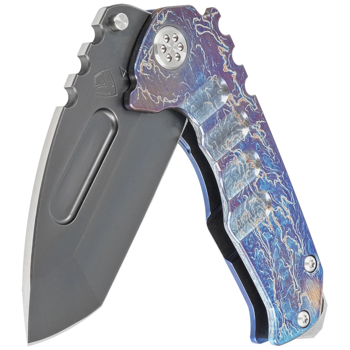 Handle - made of solid titanium dyed thermally with the help of a torch. All Praetorian variants are equipped with a D2 hardened steel backspacer, coated with NP3 which is also a glass breaker. MKT has thoroughly tested these backspacers and found that they are completely reliable and 100% functional. No tricks. There will be no other variants of this backspacer, in a different material or shape, as it is meant to save lives in an emergency, not for decoration. Wear hand and arm protection when testing, as excessive impact force will ALWAYS cause cuts! The whole thing is completed with a solid, clip, also made of titanium, of course.