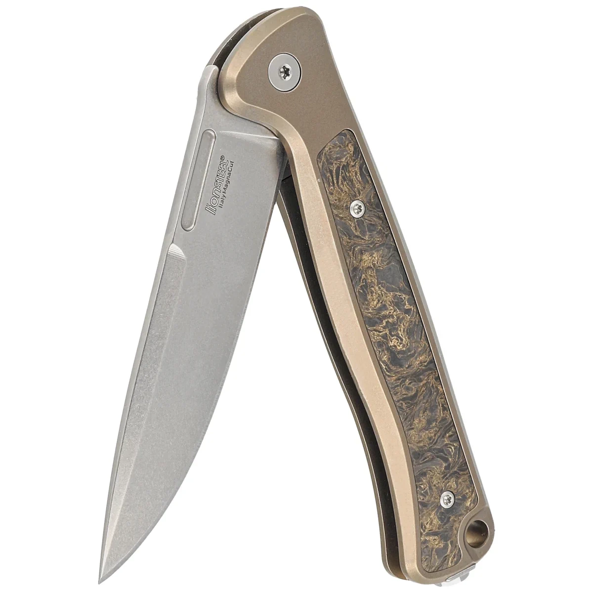 • Skinny Bronze Titanium/Gold Dark Matter Carbon Fiber, Stonewashed winner of the Imported Knife of The Year 2024 award at Blade Show. Folder by Italian manufactory LionSteel design Michele "Mollletta" Pensato with Solid technology and MagnaCut steel blade