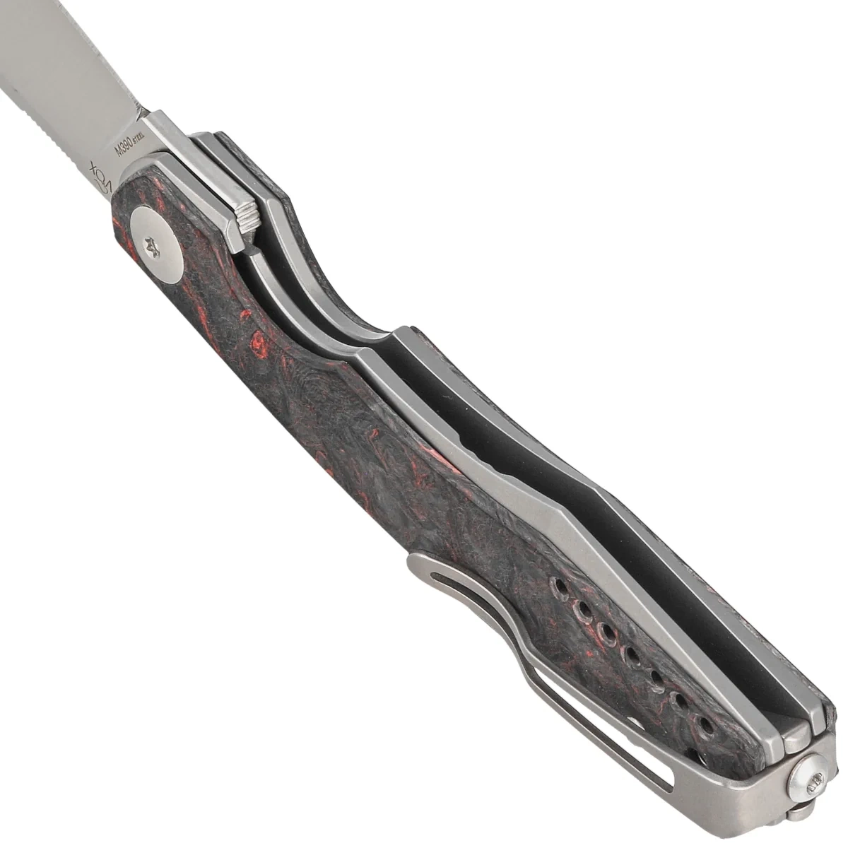 Handle - made of solid titanium 6AL4V stonewashed finish. Contouring of the covers eliminates sharp edges. On both sides there is an overlay (overlay) made of Red Dark Matter Carbon Fiber. The grips are joined together using a titanium backspacer. The single-position clip (right), made of titanium, allows the knife to be carried in tip-up position. Under the clip a lanyard hole, a hole for attaching a safety or decorative cord.