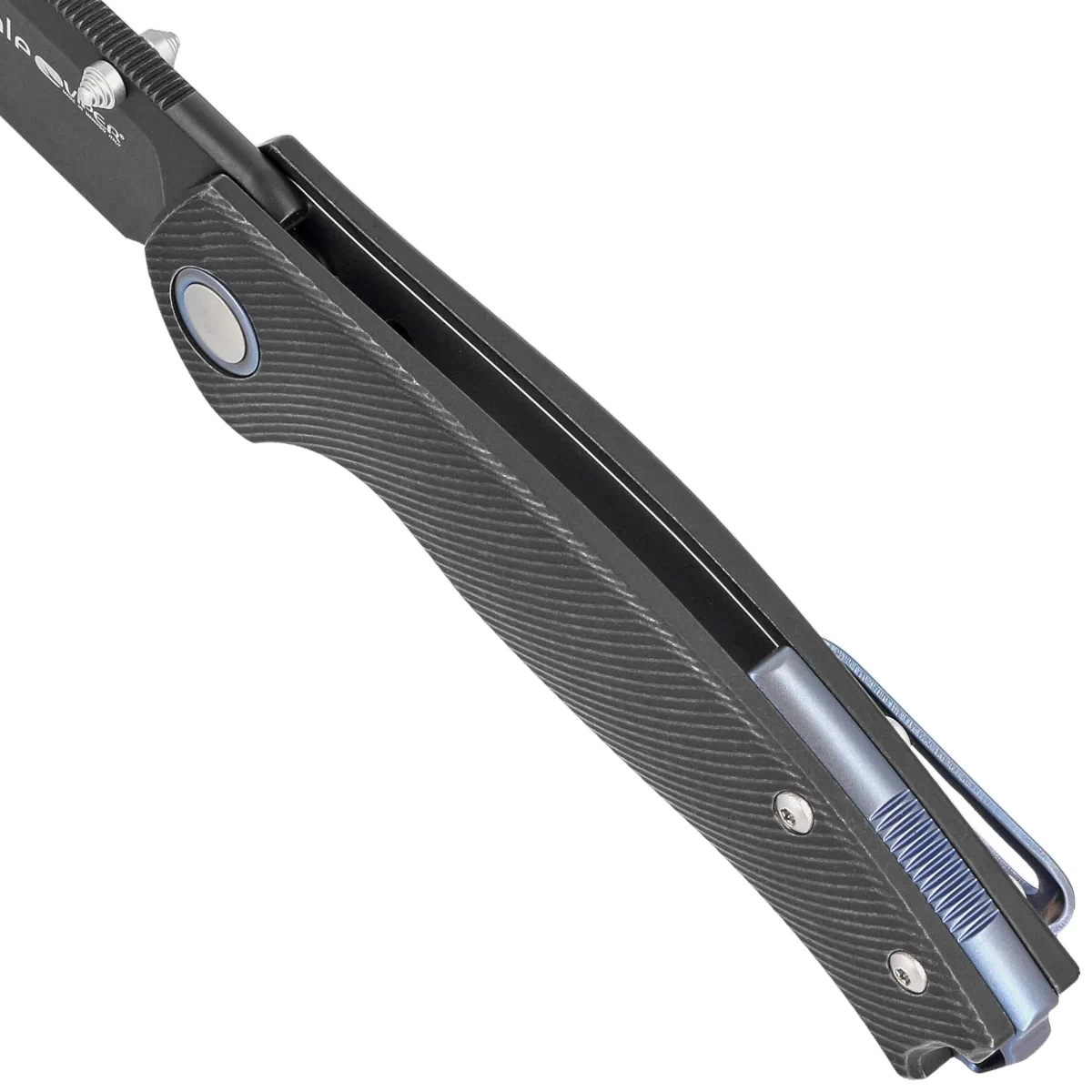 Handle - sandblasted titanium grips, artfully milled to create texture on the handle. Joined together by a CNC-milled backspacer, so the knife retains the desired rigidity of construction. The backspacer and the decorative ring around the pivot, the so-called pivot collar, are made of blue anodized titanium. The fore finger groove, made on the front, improves grip security, while forming a guard with the flipper to prevent the hand from slipping on the blade. A right-handed, single-position titanium deep-carry clip allows the knife to be carried discreetly in the tip-up (tip up) position. At the end of the Handle lanyard hole, a hole for a cord.