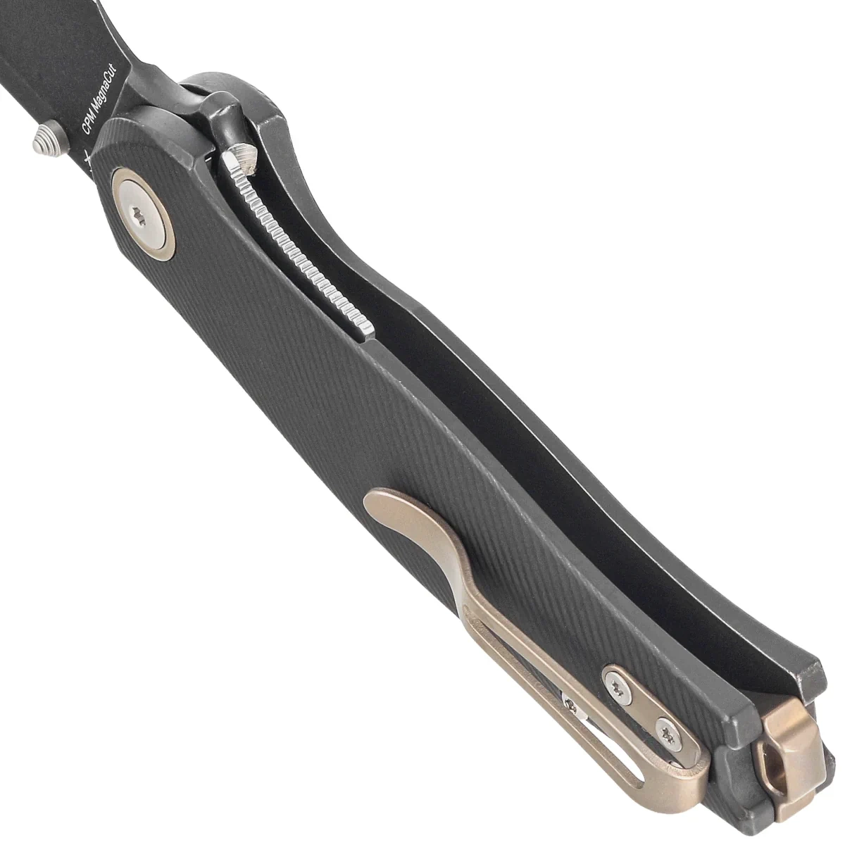 Handle - sandblasted titanium grips, artfully milled to create texture on the handle. Joined together by a CNC-milled backspacer, so the knife retains the desired rigidity of construction. The backspacer and the decorative ring around the pivot, the so-called pivot collar, are made of bronze anodized titanium. The fore finger groove, made on the front, improves grip security, while forming a guard with the flipper to prevent the hand from slipping on the blade. A right-handed, single-position titanium deep-carry clip allows the knife to be carried discreetly in the tip-up (tip up) position. At the end of the Handle lanyard hole, a hole for a cord.