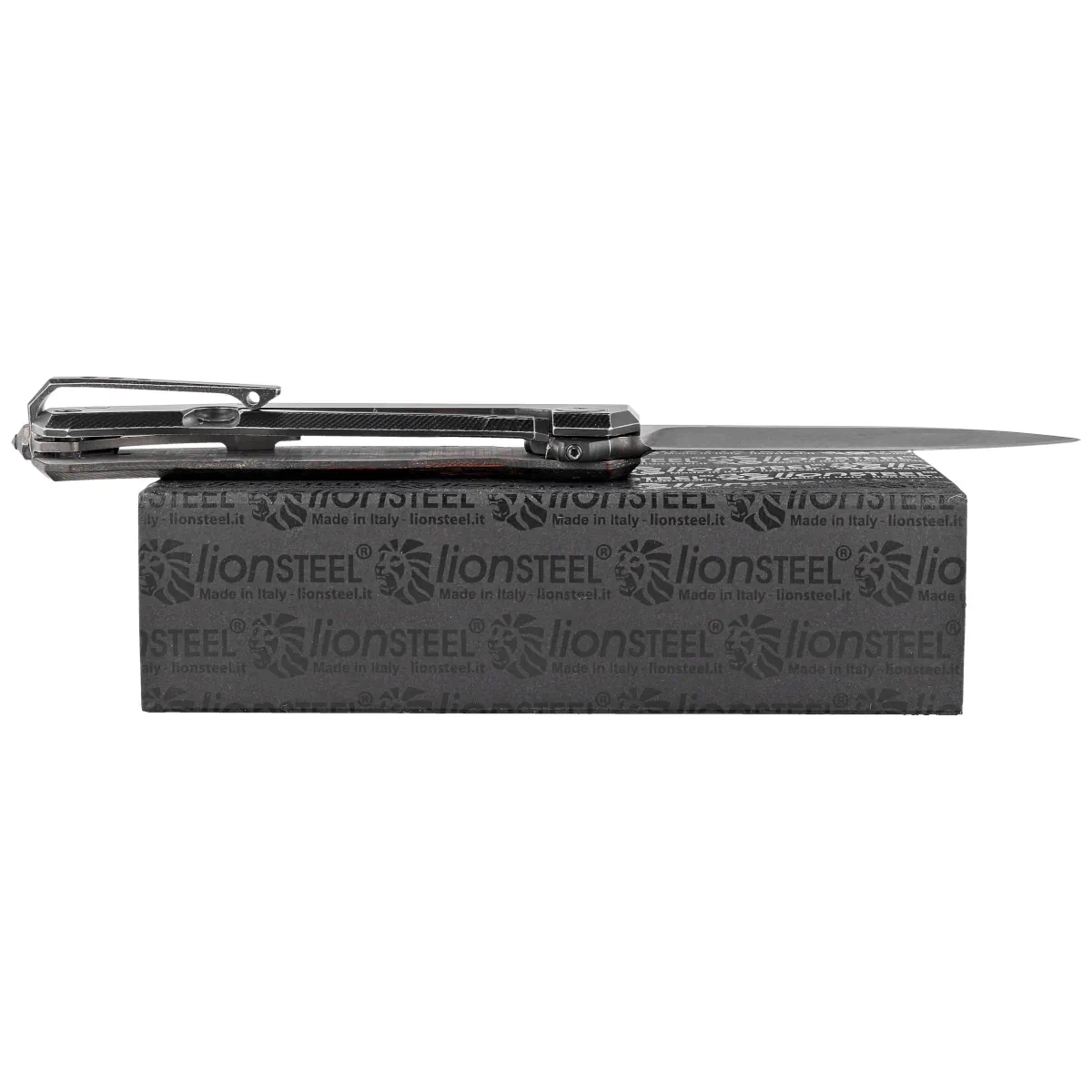 Blade - Drop Point type finished with a scratch-masking bath of fine Stonewashed pebbles and then coated with a black coating, an effect LionSteel called Old Black. The Plain blade was derived with a Flat Grind which gives excellent cutting edge geometry and extreme cutting performance. Located on the underside of the Blade, the protrusion / flipper, supported by the Double Crown ball bearing system, facilitates the opening of the blade. In the open position it serves as a lower guard / hilt protecting the hand from slipping off the handle. The whole is locked with a proven frame lock with a steel inlay to prevent wiping of the lock face.