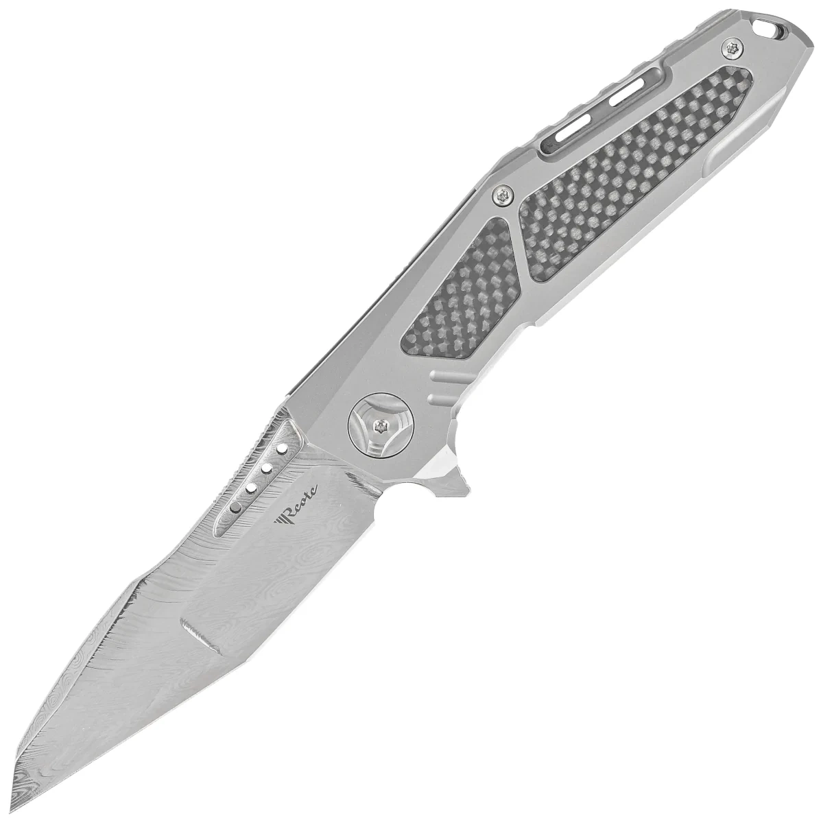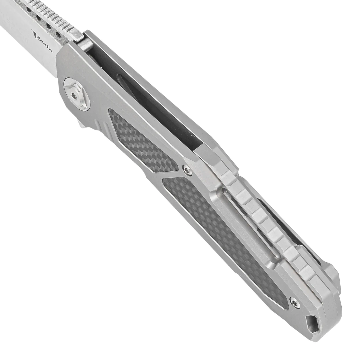 • K-3 Tanto Grey Titanium/Carbon Fiber, Damasteel Damascus folder from the Reate Knives manufactory. Stunning workmanship and the finest materials are the hallmarks of this company's knives. Titanium Handle with Carbon Fiber inlays, Damasteel Damascus steel