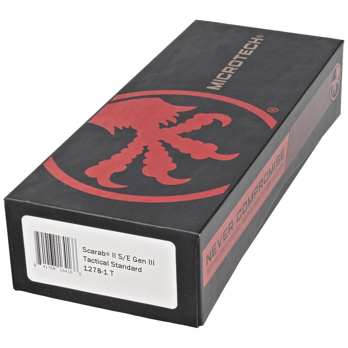 Scarab II S/E Gen III Black Aluminum/3M, Tactical featuring a tactical blade finish it represents the pinnacle of excellence among tactical automatic knives, taking inspiration from the original Microtech Ultratech design. Built to withstand the toughest conditions, the new Scarab II is the best choice for intense use. Retaining the stylistic features of its predecessor, it sets a new benchmark for OTF (Out The Front) technology.