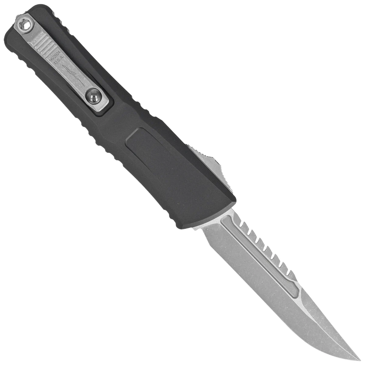 Combat Troodon Interceptor Gen III Signature Black Aluminum, Apocalyptic is the largest OTF (Out The Front) automatic knife in the Troodon series, built for a wide range of utility applications. Precisely crafted, it features a sophisticated and infernally fast mechanism that extends a razor-sharp new type of blade - the Interceptor. 100% made and assembled in the USA. Designed by Anthony Marfione, knifemaker and owner of Microtech Knives.