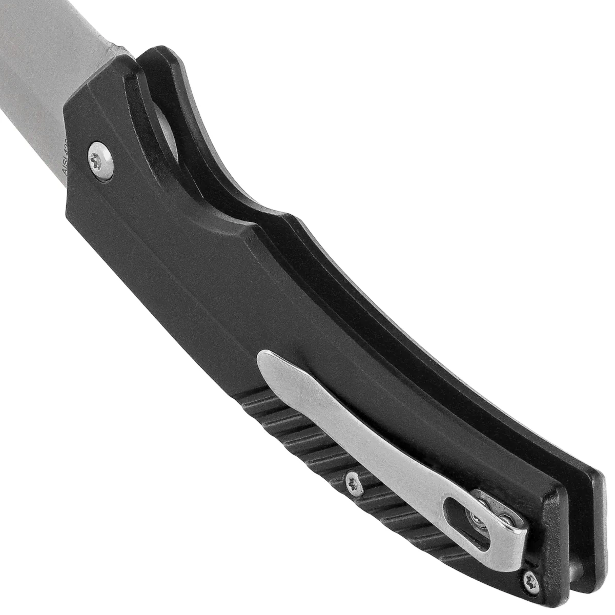 Handle - made of black anodized aluminum, whose beveled edges of the covers eliminate sharp edges for comfort, and the fore finger groove made on the front improves grip security. The open-backed design, fixed with steel spacer sleeves, reduces weight and facilitates cleaning. On the left grip, a button activating the opening mechanism, for safety tucked into a slight recess to avoid accidental opening. Behind the button a locking slide, further protecting against accidental opening. A single-position (right) deep-carry clip allows you to carry the knife discreetly in your pocket in tip-up (blade tip up) position.