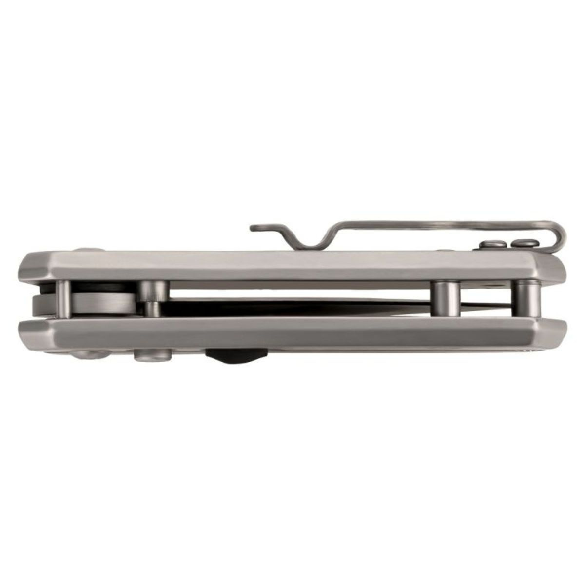 Handle - made of stainless steel, the beveled edges of the sheaths eliminate sharp edges for comfort, and the simple shape makes it easy to fit any hand. The open-backed design - fixed with steel spacer sleeves - reduces weight and facilitates cleaning. On the left grips the button that activates the opening mechanism, for safety hidden in a slight recess to avoid accidental opening. Behind the button a locking slide, further protecting against accidental opening. A single-position (right) deep-carry clip allows you to carry the knife discreetly in your pocket in tip-up position (blade tip up).