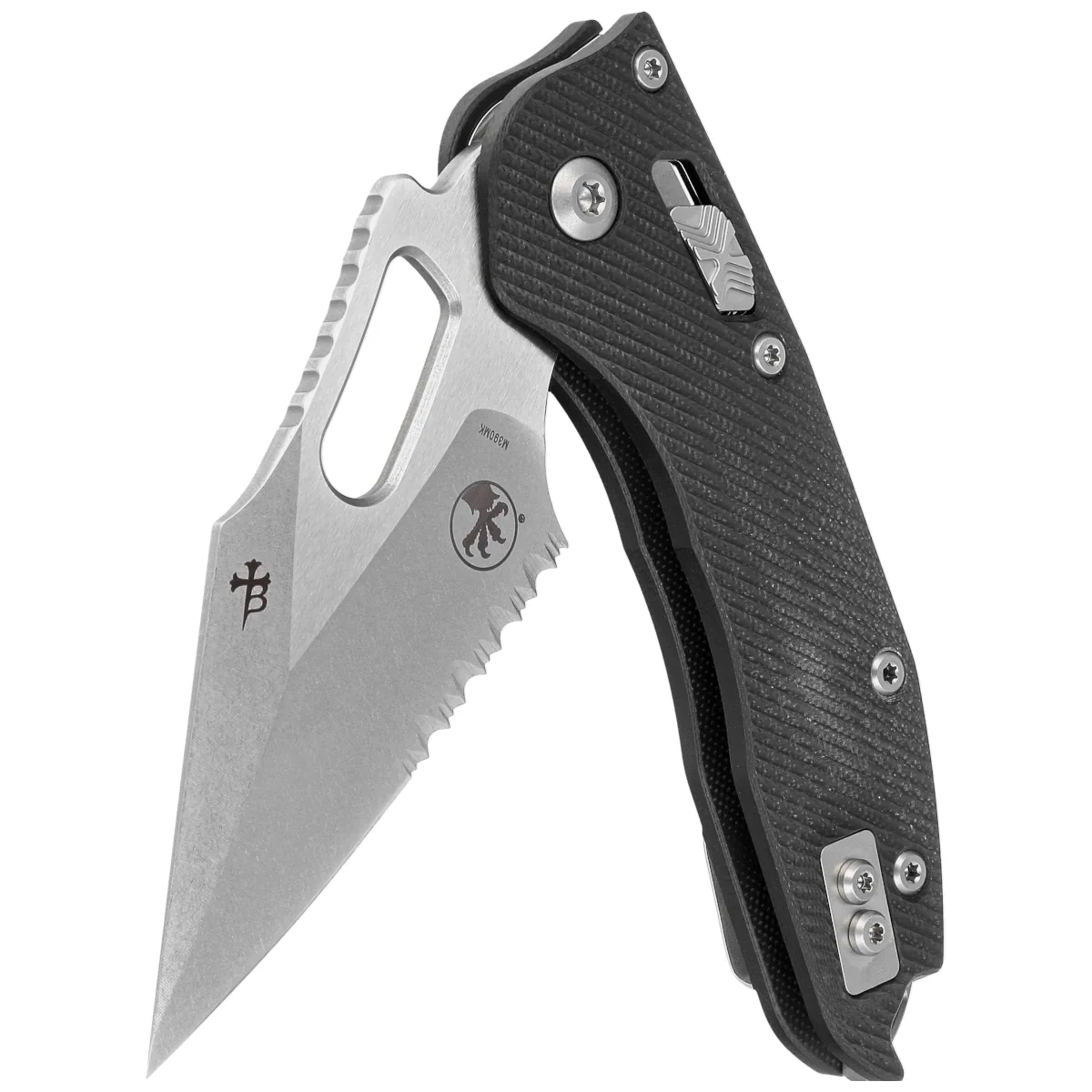 Handle - made on CNC milling machines with excellent precision, made of G10 composite, a virtually indestructible material insensitive to weather, resistant to chemicals and mechanical damage, with a deeply milled 3D Fluted structure . Wide locking slide with Microtech's signature stepped X structure. Both grips are bolted together with a solid aluminum backspacer. The double-sided (right / left) clip allows you to discreetly carry the knife in tip-up position. The protruding part of the backspacer in which there is a hole for a rope, can also serve as an improvised glass breaker.