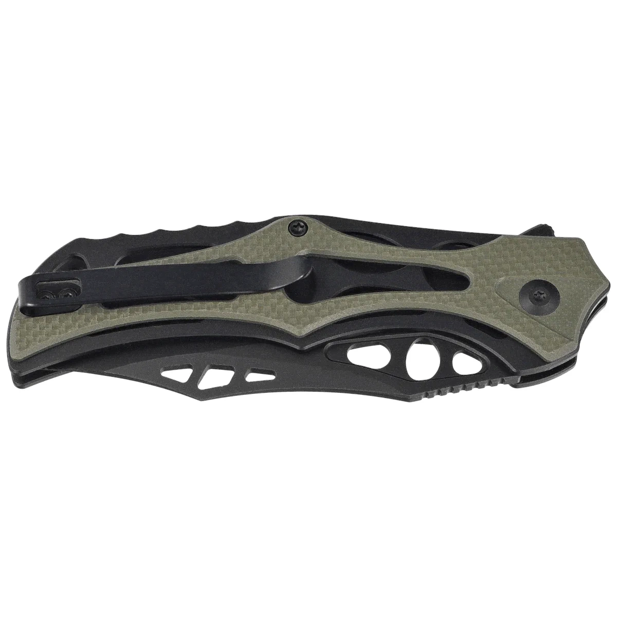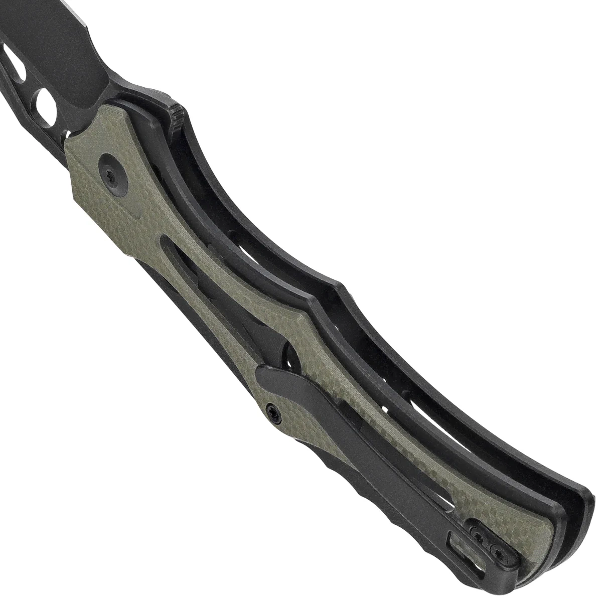• Biophase Black Aluminum / OD Green G10, Black Stonewashed large all-purpose folding knife with avant-garde styling. Nitro-V stainless steel head, skeletonized aluminum and G10 composite liners. Extremely secure grip!
