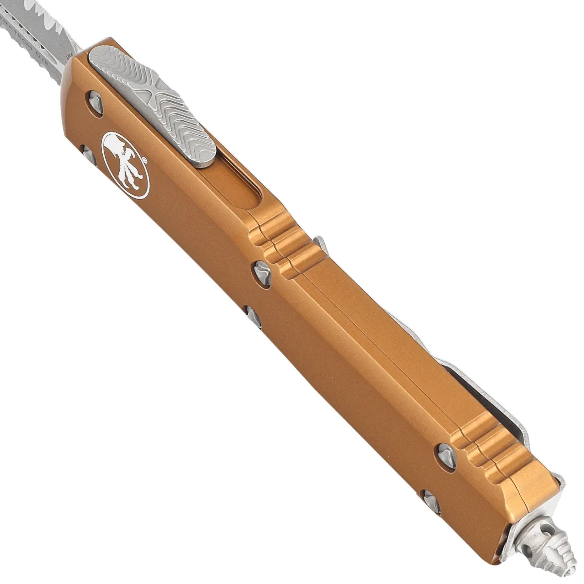 Ultratech D/E Tan Aluminum, Apocalyptic P/S is a full-size OTF (Out The Front) automatic knife from the Ultratech series. Equipped with a hell of a fast mechanism that extends a razor-sharp blade in a striking Apocalyptic patina. 100% made and assembled in the USA. Designed by Anthony Marfione, knifemaker and owner of Microtech Knives.