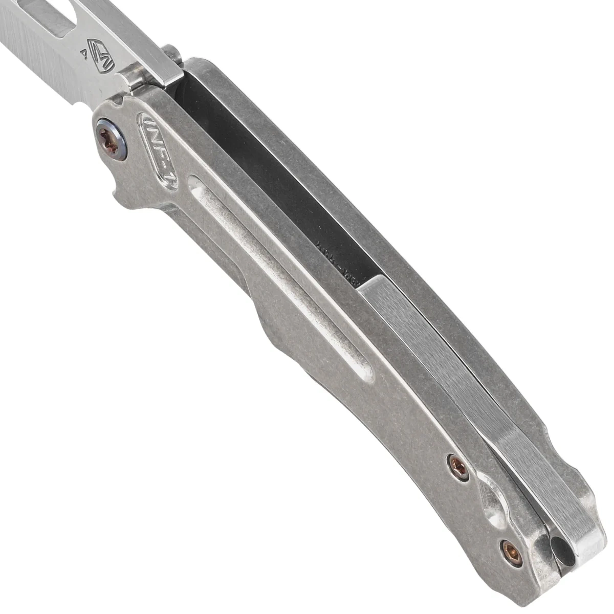 Blade - slim Drop Point profile finished with a machine-applied "tumbled" technique. The hand-crafted medium-height hollow grind delivers exceptional piercing and slicing capabilities with tank-like durability. The striking combination of the finger groove and thumb hole and the minimalist front flipper make the blade truly unique. To enhance resistance to debris, phosphor bronze washers are used, making the pivot mechanism more reliable for field use. A powerful titanium frame lock bar secures the blade from folding, unfolded and secured the knife is as solid as an armoured cash register.
