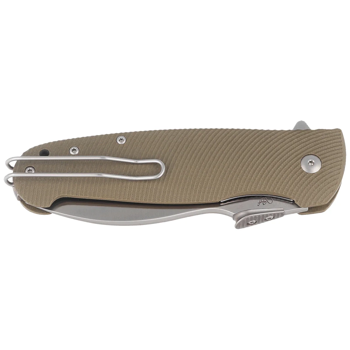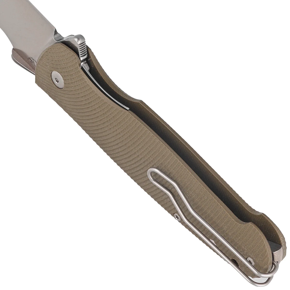 Handle - made of G-10, a virtually indestructible plastic, insensitive to weather, resistant to chemicals and mechanical damage, milled texture on the surface for improved grip confidence. The covers were screwed to a titanium backspacer, resulting in the practically indestructible nature of such a design. The right-side deep carry clip allows you to carry the knife discreetly in tip-up position (with the tip of the blade up). At the end of the Handle lanyard hole, a hole for a rope.