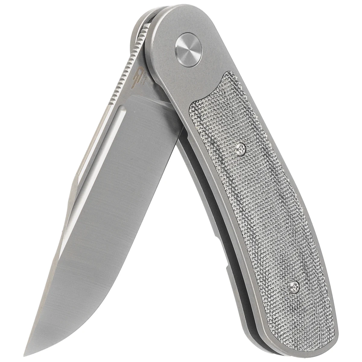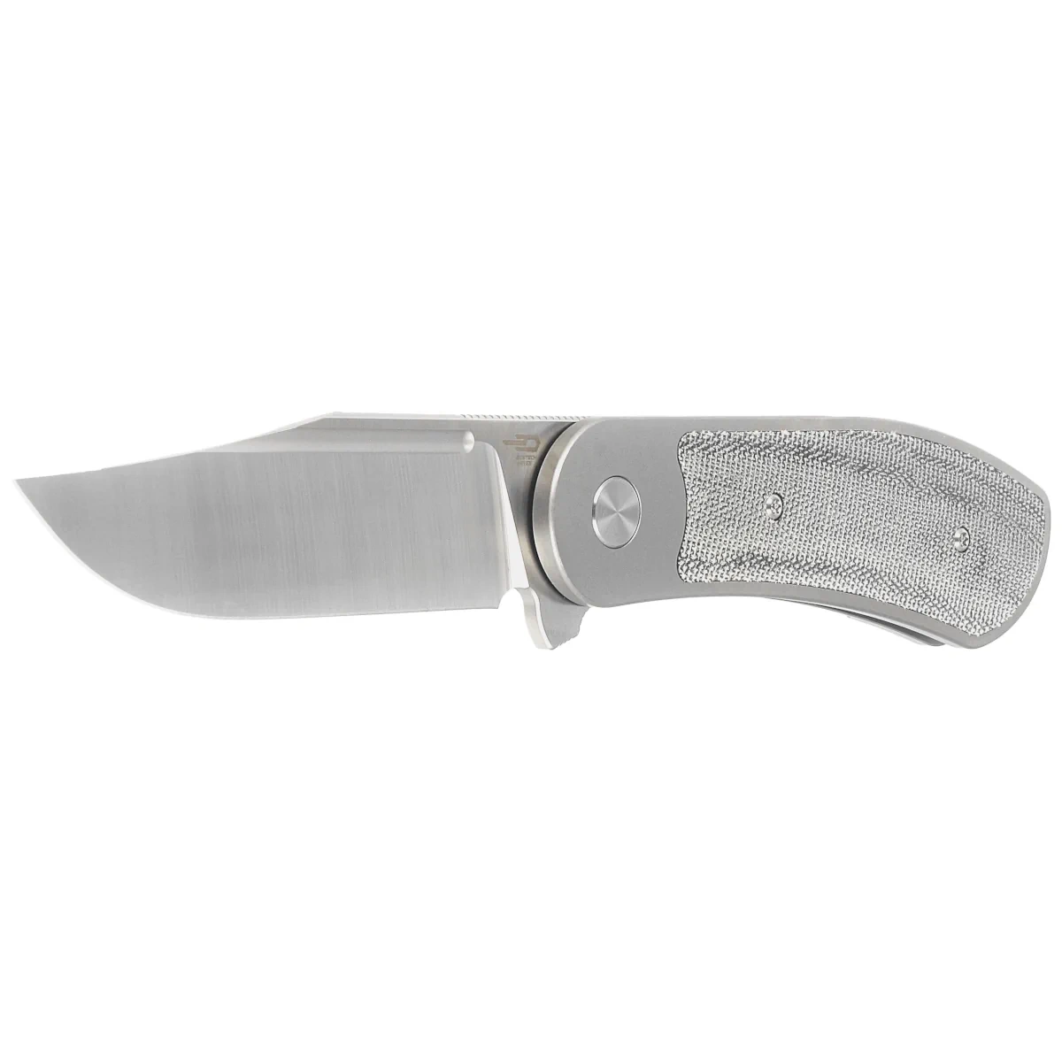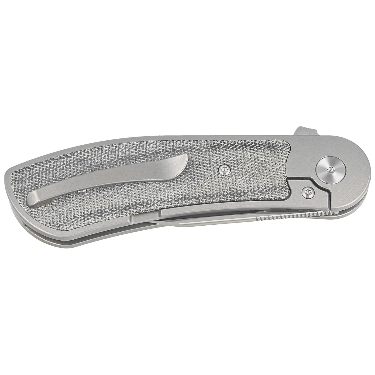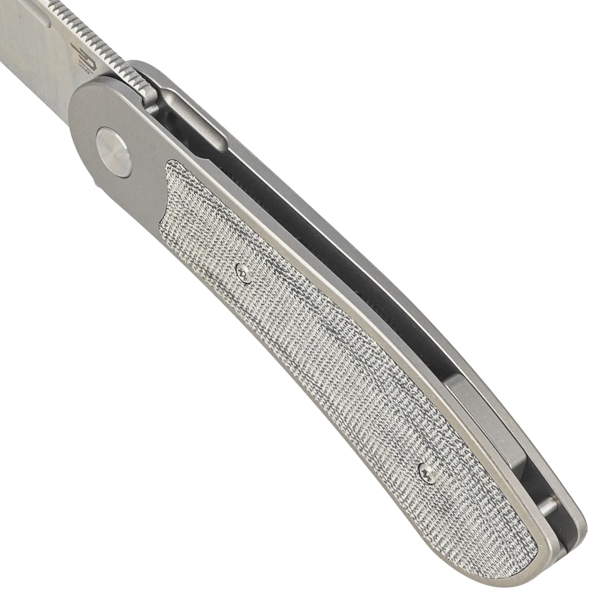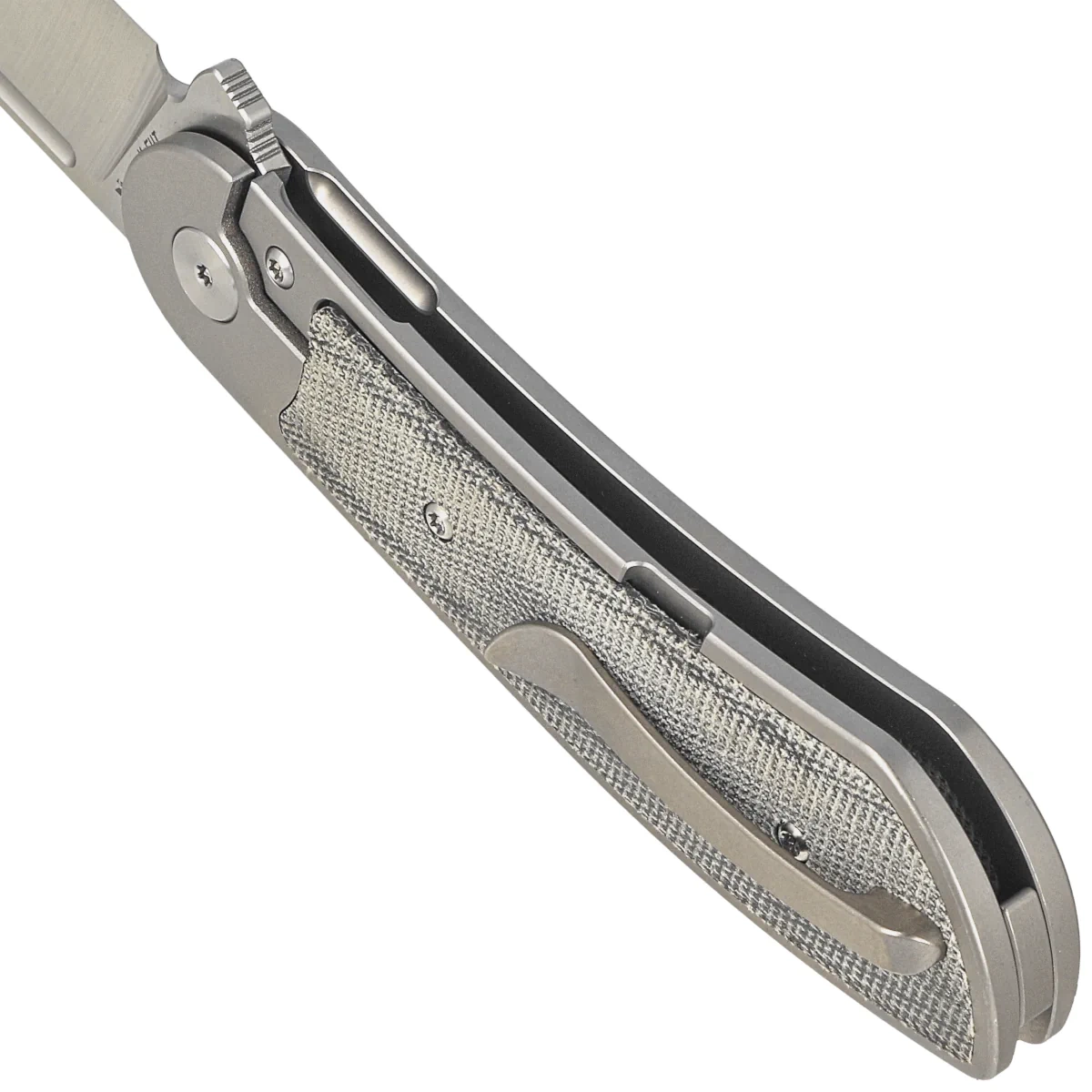 Handle - flat, made of solid 6AL4V titanium with a perfectly integrated Micarta composite inlay. Chamfered edges of the covers eliminate sharp edges for comfort and improve grip security. The solid titanium backspacer to which the grips are attached guarantees the rigidity and strength of the entire structure. A single-position, right-handed titanium clip allows the knife to be carried in tip-up position, with the tip of the blade upward. In the recess of the backspacer a hidden place for threading a safety or decorative cord.