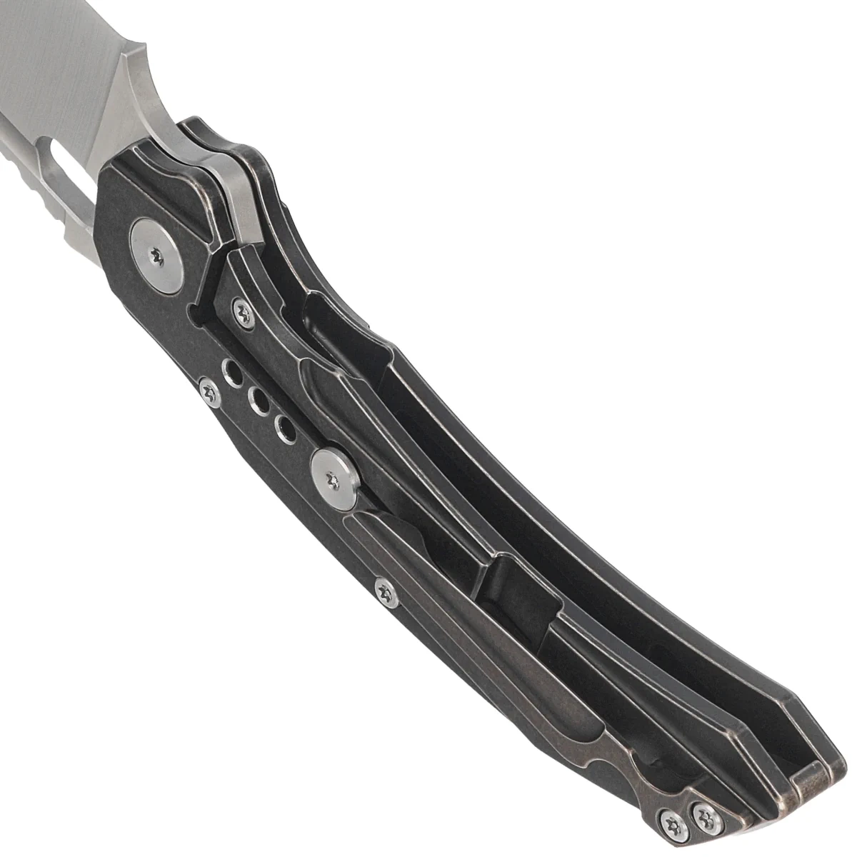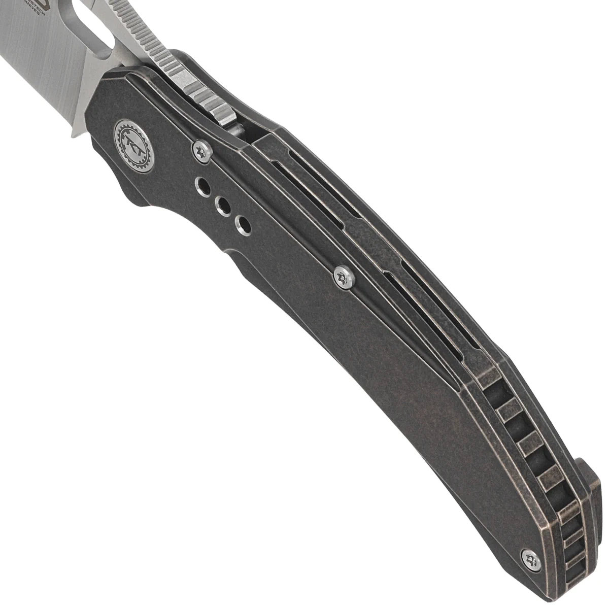 Handle - is two pieces of solid titanium 6AL4V. Chamfered edges of the covers eliminate sharp edges for comfort and improve grip security. The solid titanium backspacer to which the grips are attached guarantees the rigidity and strength of the entire structure. The pivot axis decorated with the logo of the designers, Todd Knife and Tool. A single-position, right-handed titanium clip allows the knife to be carried in tip-up position, with the tip of the blade upward.