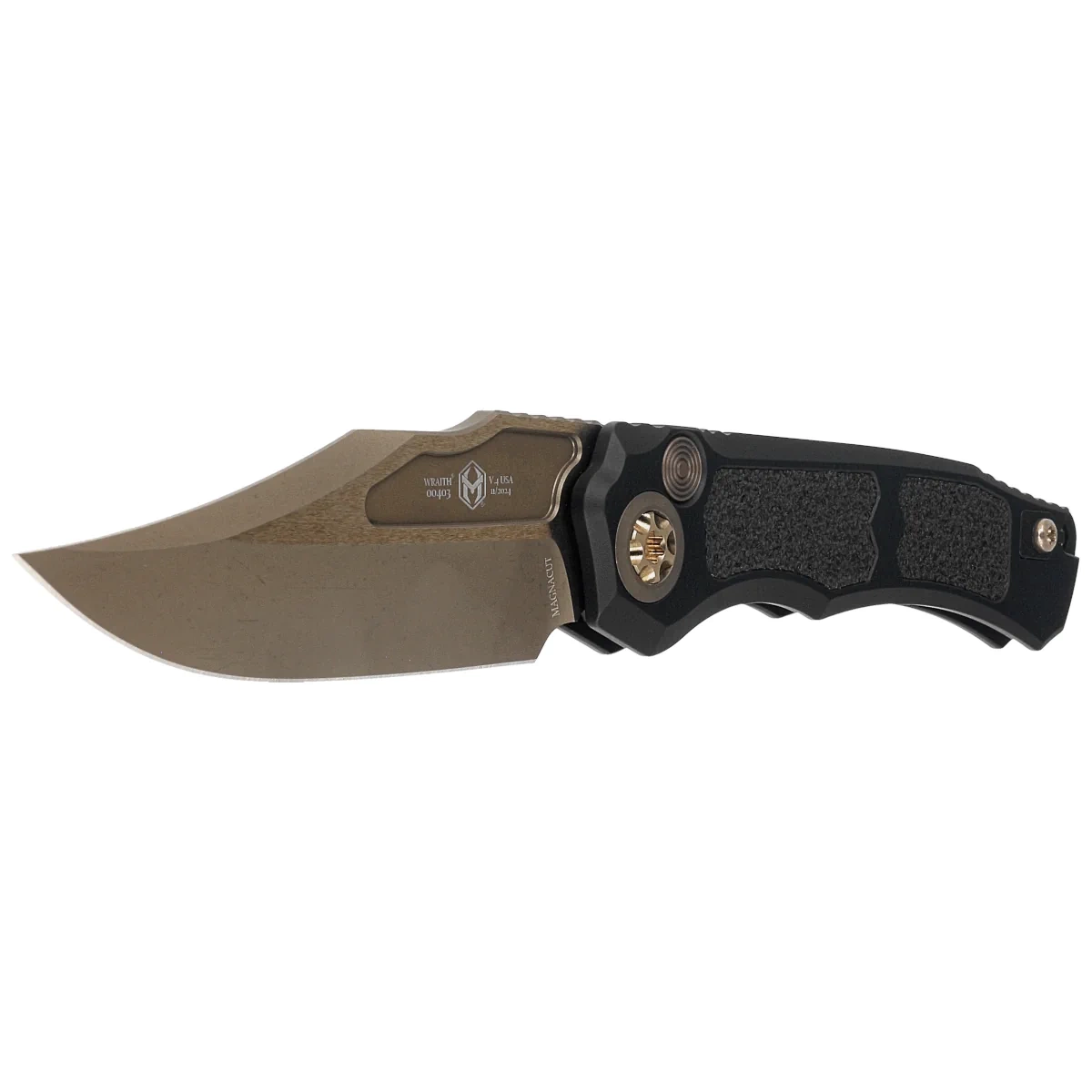 • Wraith V.4 Auto Black Aluminum/3M, Bronze Stonewashed, powerful automatic switchblade type designed by Tony Marfione Jr. Built for demanding users, it features robust aluminum scales and blade crafted from premium MagnaCut steel. An outstanding tool!