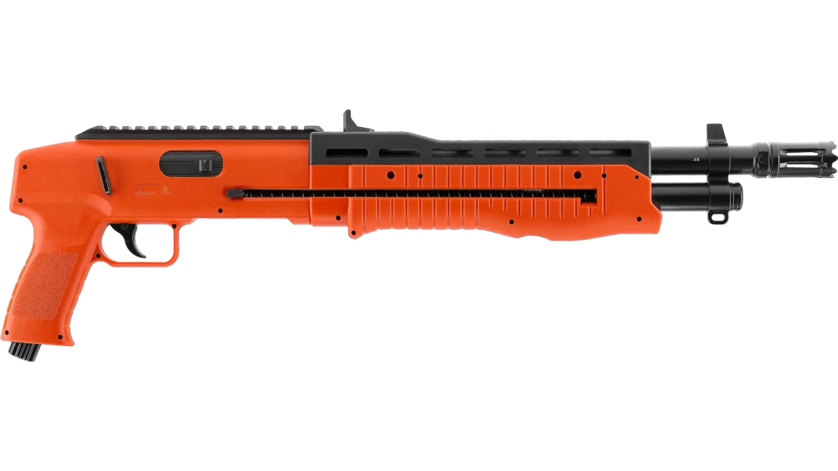 The P2P HDB 68 is a compact RAM shotgun chambered in .68 caliber, powered by a 12 g CO₂ cartridge. It features a quick-piercing CO₂ system, a pump-action reloading mechanism, Picatinny mounting rails, and a high-capacity magazine holding up to 16 rounds. The orange color variant enhances visibility in stressful situations, ensuring greater readiness for defense.