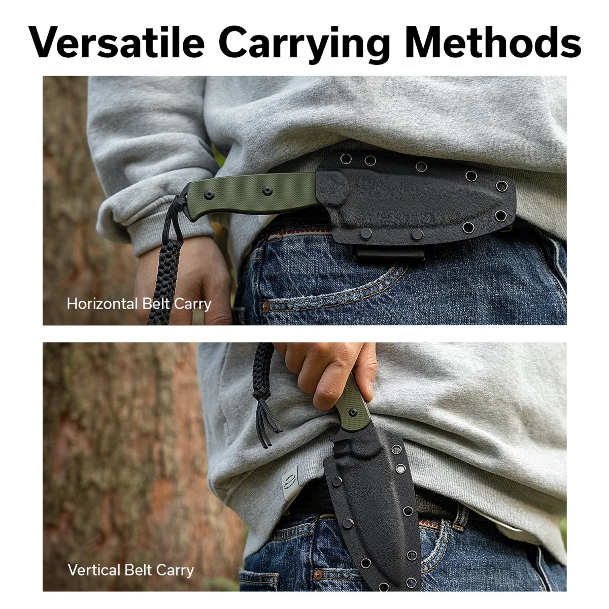 Toxodon OD Green G10, Black is a compact EDC knife with a fixed blade. The classic drop point blade, made of 9Cr18MoV stainless steel, features excellent corrosion resistance and exceptional sharpness, making it an indispensable tool for everyday use. Handle made of durable G10 composite provides a secure and comfortable grip, even in harsh conditions. The low descending line of the blade provides additional protection against your hand slipping on the Blade. A kydex sheath allows for convenient attachment to a belt or a mount with a Tek Lok type attachment. The Toxodon is an excellent everyday companion that combines reliability, functionality and elegance. Its compact size and solid construction make it an ideal choice for anyone who appreciates high quality and precision workmanship.