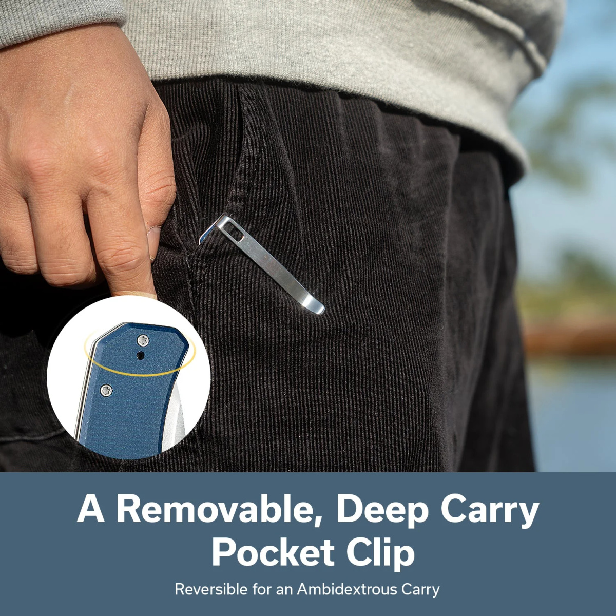 Handle - made of Canvas Micarta composite virtually indestructible plastic, insensitive to weather conditions, resistant to chemicals and mechanical damage. Chamfered edges of the covers eliminate sharp edges for comfort, grip. Open-backed design fixed with steel spacer sleeves reduces weight and facilitates cleaning. A fore finger groove made on the front improves grip security. Two-position, right/left deep carry clip allows you to carry the knife discreetly in your pocket in tip-up position (blade tip up).