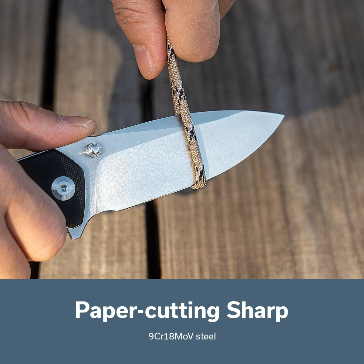 • Skarnax Black G10, Satin large EDC folder designed for daily use. Features a full-size G10 composite handle and a blade made of 9Cr18MoV stainless steel. It can be opened in two ways: using the flipper or the dual thumb studs on the blade.