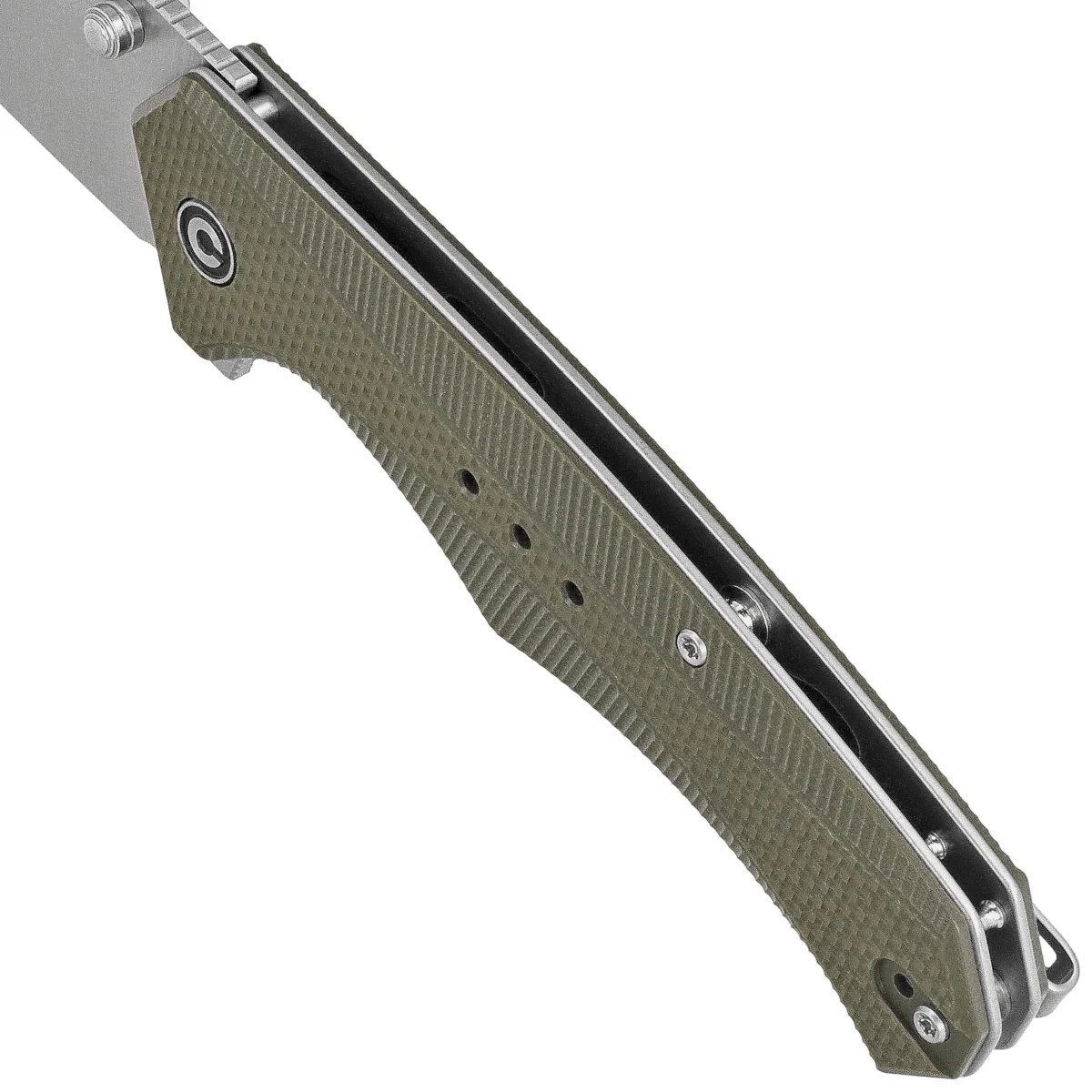 Handle - made of G10 composite, practically indestructible plastic, insensitive to weather conditions, resistant to chemicals and mechanical damage. The chamfered edges of the covers eliminate sharp edges and the rough textured and textured surface enhances comfort and sure grip. The open-backed design, fixed with steel spacer sleeves, reduces weight and facilitates cleaning. The pivot axis is decorated with a stylized Civivi brand logo. A two-position, right/left deep carry clip allows you to carry the knife discreetly in your pocket in tip-up position (blade tip up).