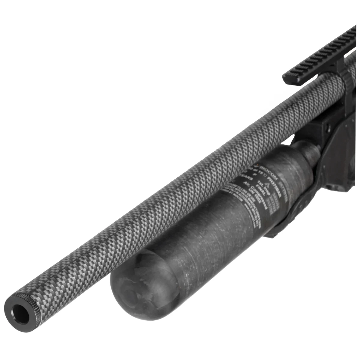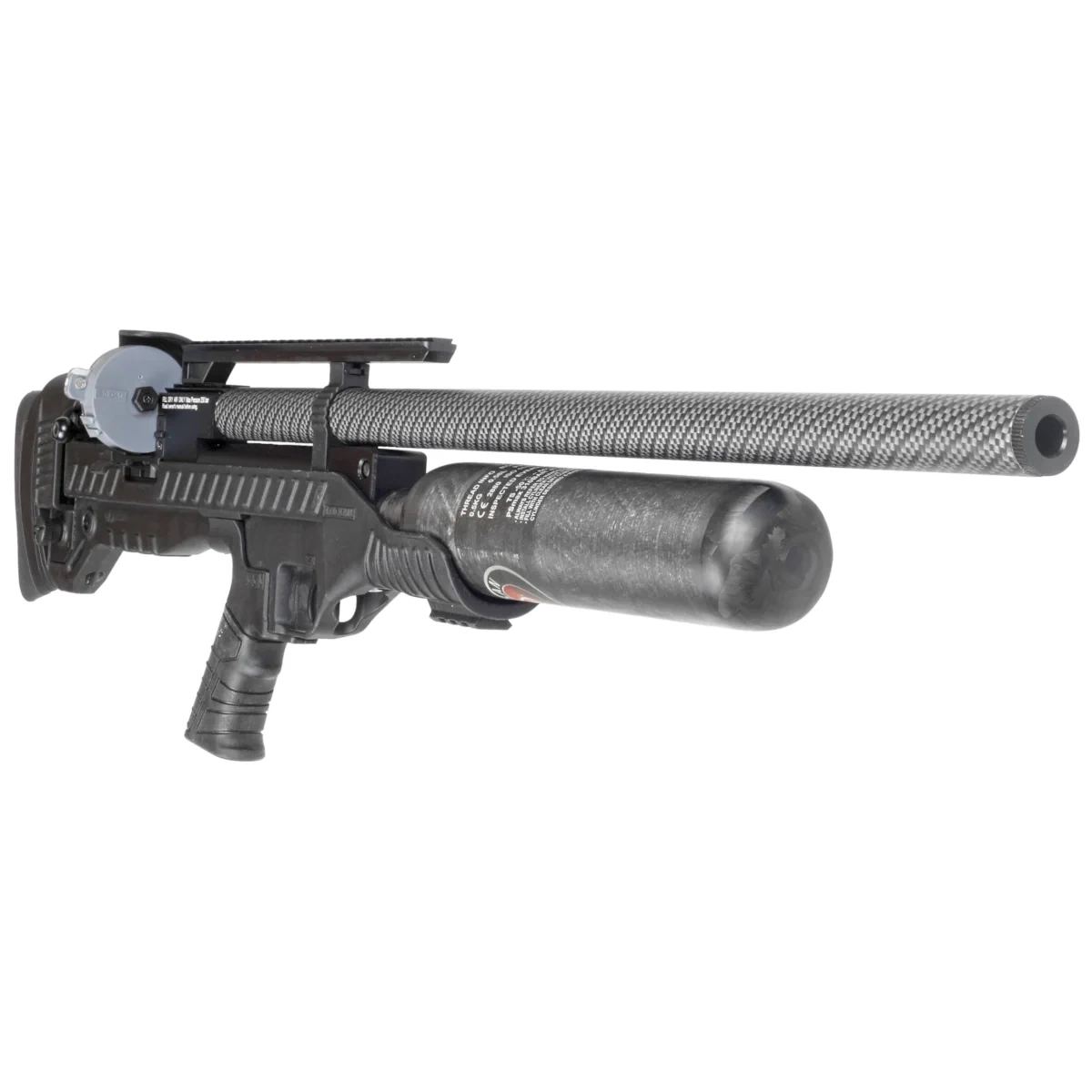 Power Supply - a fixed 580 cc carbon fiber air tube. Fully charged, it allows 100–130 effective shots, depending on caliber (FAC version). A pressure gauge monitors the air reservoir, requiring a minimum operating pressure of 130 bar for the FullAuto and SemiAutoAction systems. For efficient filling, a 300-bar technical or diving tank is recommended.