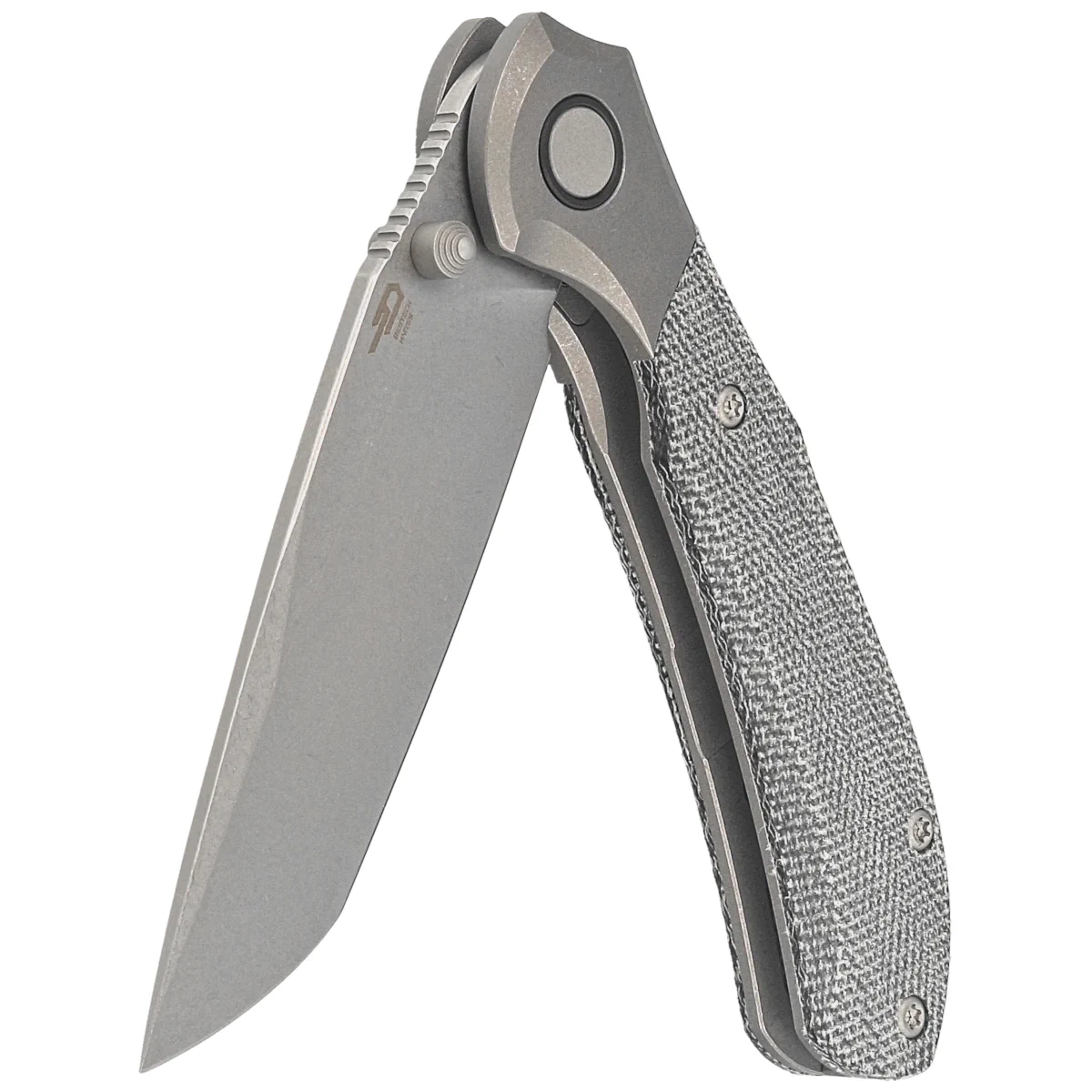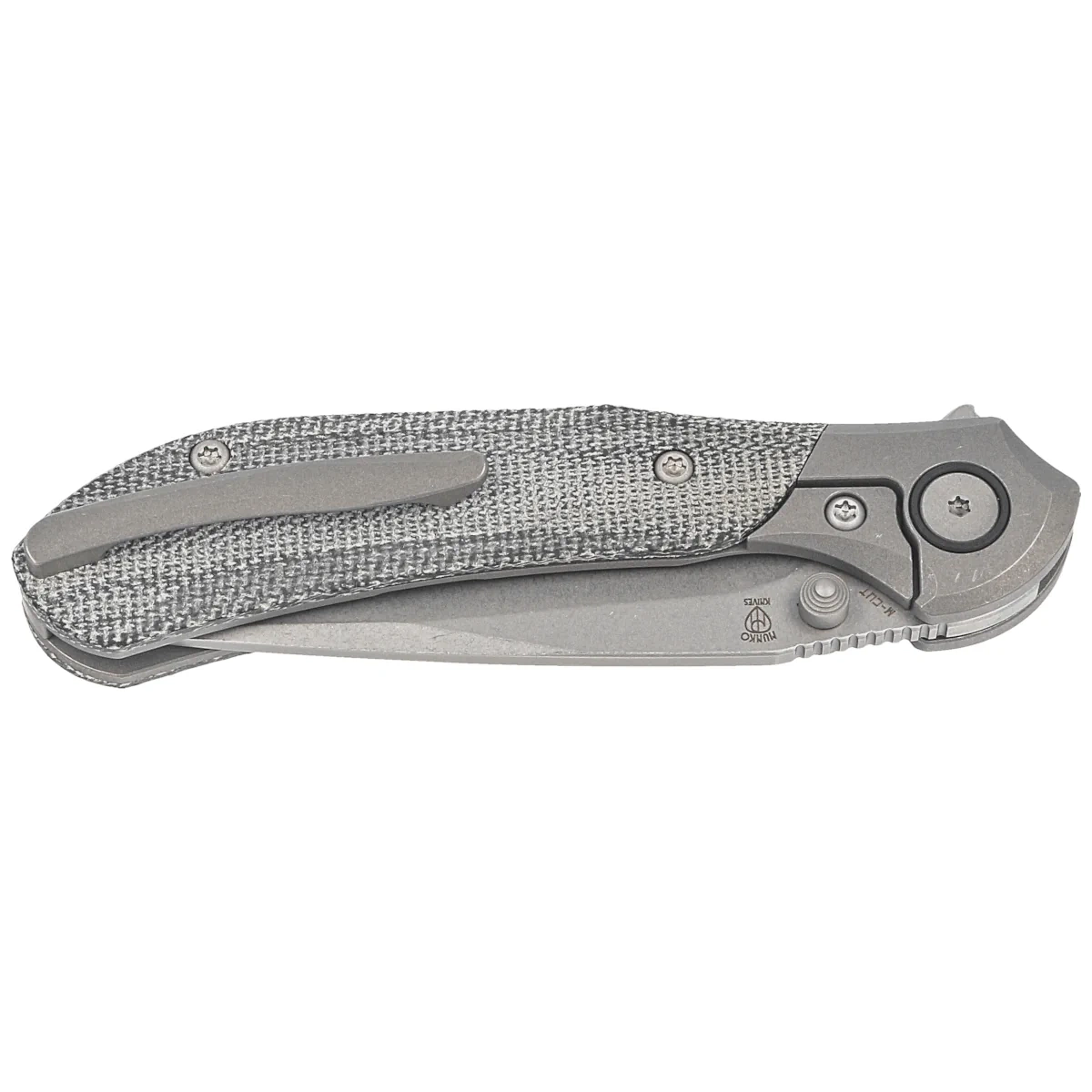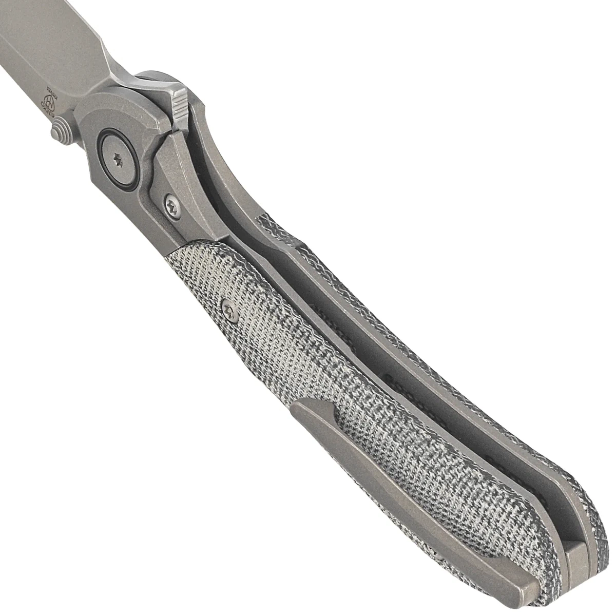 Handle - made of solid 6AL4V titanium with a perfectly integrated Micarta composite inlay Chamfered cover edges eliminate sharp edges for comfort, and a fore finger groove improves grip security. The titanium backspacer to which the grips are attached guarantees the rigidity and strength of the entire construction. A single-position, right-handed titanium clip allows the knife to be carried in tip-up position, with the tip of the blade upward.