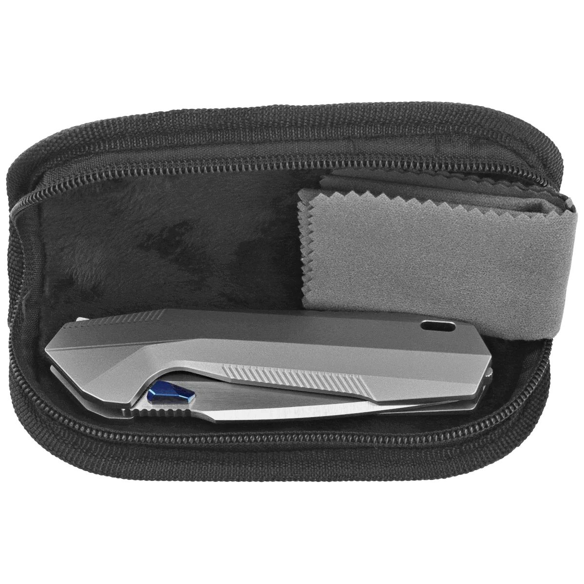 Handle - an exoskeleton made of titanium 6AL4V on which is mounted a monolithic housing beautifully milled with the help of CNC machine tools from a single piece of titanium. The innovative design provides outstanding robustness and resistance. All of it subjected to a manual Ceramic Sandblasting process. In the back you will find a locking slide, thanks to it you have the possibility to remove the outer casing, for example, to clean the knife. A single-position titanium (right) deep-carry clip allows you to discreetly carry the knife in your pocket in tip-up position (blade tip up).