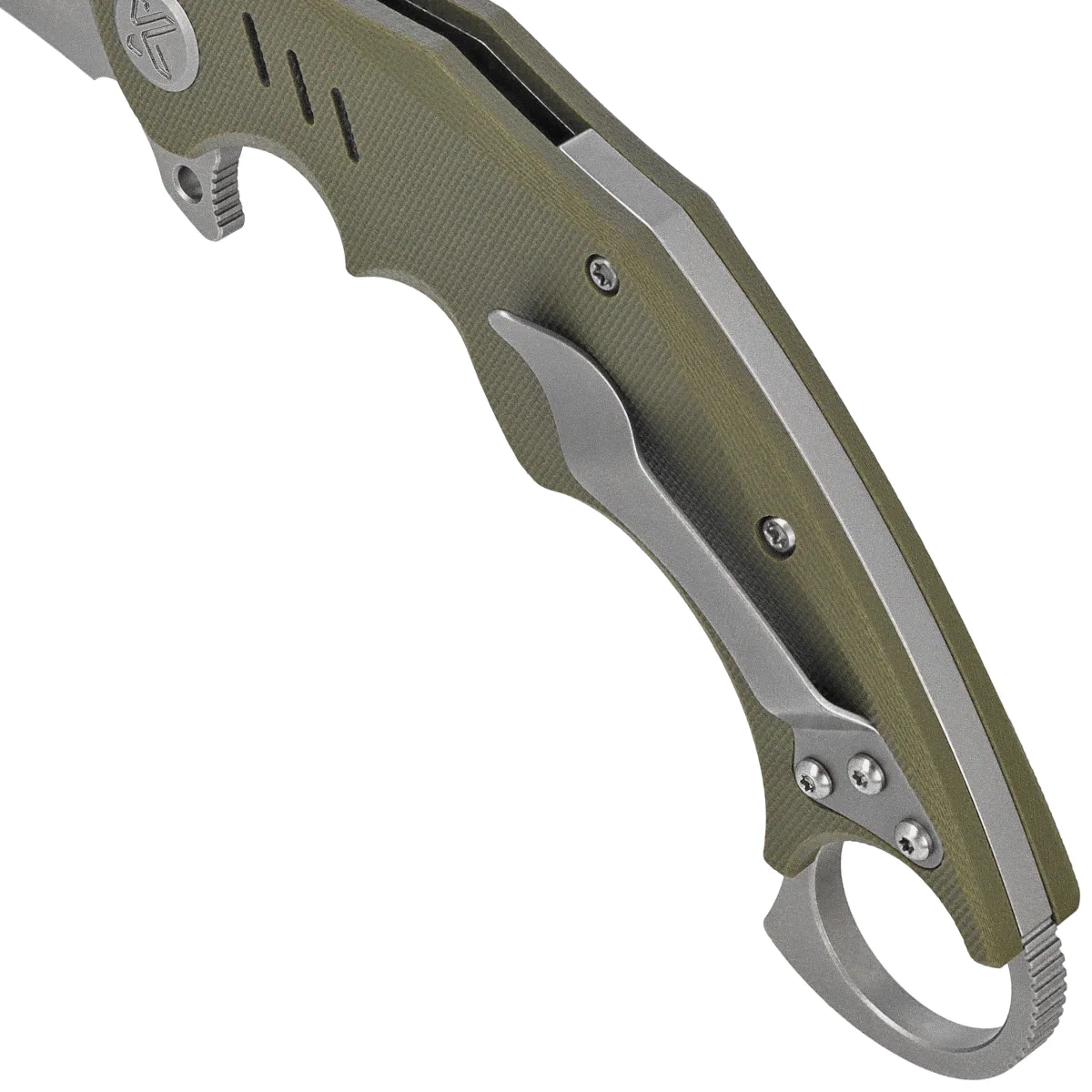 The Wrath Green G10, Beadblasted is a precision-engineered karambit, designed by MUZI Design. It features a curved, claw-like blade made of Sandvik 14C26N steel, which is characterized by high corrosion resistance and the ability to maintain sharpness for long periods of time. The contoured handle made of durable G10 composite offers a secure grip and excellent ergonomics, making the knife comfortable during heavy use. The design allows for three ways of opening - using a flipper, thumbhole and quick-open function against the edge of the pocket. The compact size and thoughtful geometry make the Wrath an ideal tool for those looking for reliability and style. Every component has been designed with durability and precision in mind, which sets this model apart from other karambits on the market.