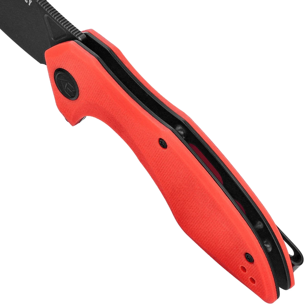 Handle - grips made of G10 composite, a material extremely mechanically durable and practically completely resistant to weather and chemicals, textured for improved grip security, screwed to the steel frame of the knife. The so-called open-backed design attached by steel spacer sleeves reduces weight and facilitates cleaning. The simple, sturdy design gives you the assurance of many years of use. A fore finger groove improves grip security and creates a mini-guard to prevent your hand from slipping on the blade. The pivot axis is decorated with a stylized manufacturer's logo. A two-position (right/left) metal deep-carry clip allows you to carry the knife discreetly in your pocket in tip-up position (blade tip up).