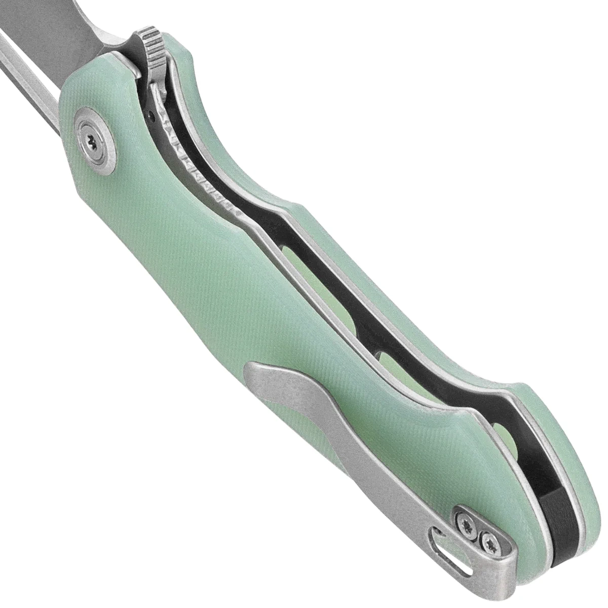 Handle - grips made of G10, a material extremely mechanically durable and practically completely resistant to weather conditions and chemicals, textured for improved grip security, screwed to the steel frame of the knife. The backspacer to which the grips are attached guarantees the rigidity and strength of the entire structure. The simple, sturdy design gives the assurance of many years of use. A deep finger undercut (fore finger groove) improves grip security. The pivot axis is decorated with a screw with a stylized manufacturer's logo. A single-position (right) metal deep-carry clip allows you to carry the knife discreetly in your pocket in tip-up position (blade tip up). Hidden in the back of the Handle is a place to thread a safety or decorative cord.