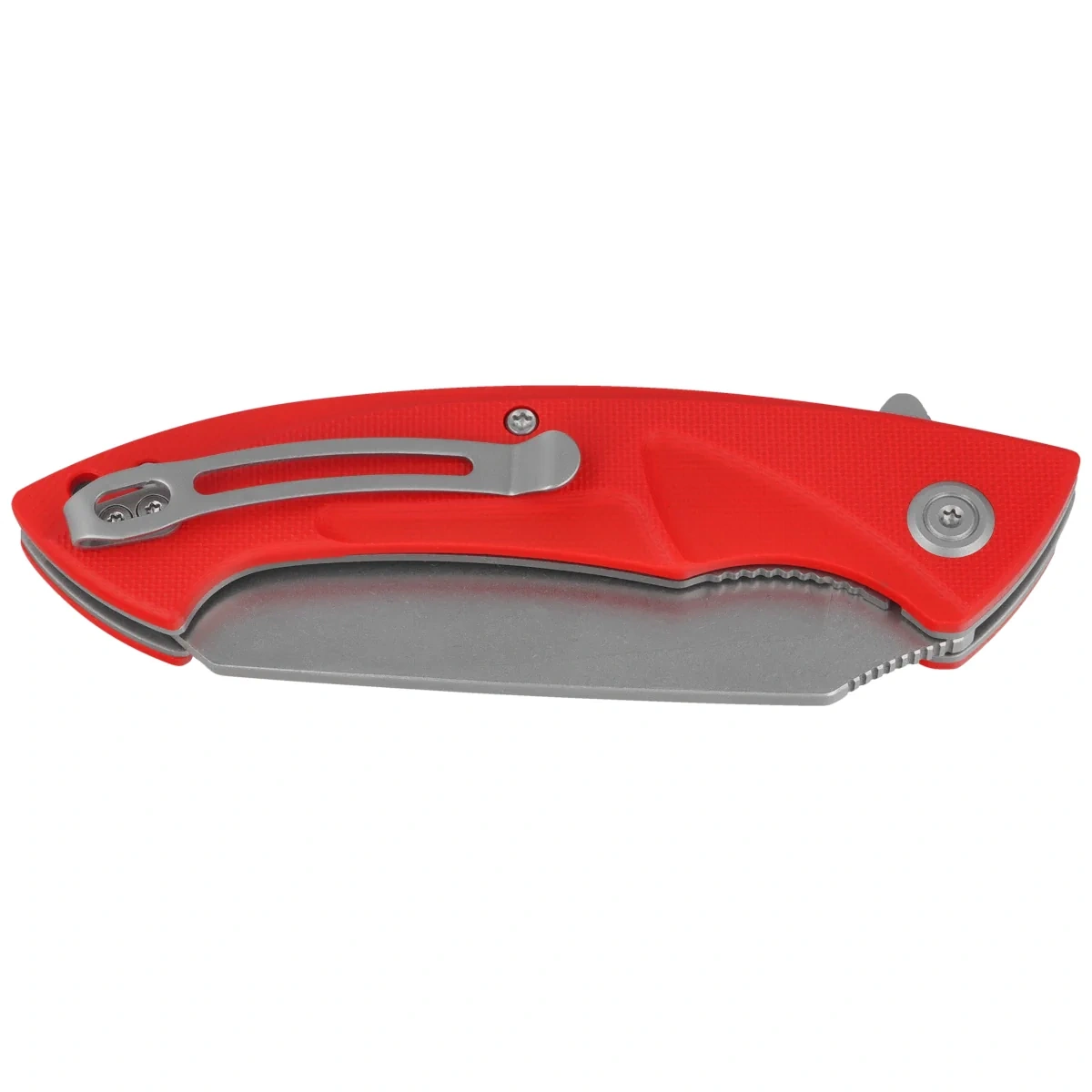 - Anteater Red G10, Sandblasted folding EDC knife with a blade made of Sandvik 14C28N steel. The handle is made of G10 composite, ergonomic and textured. The opening mechanism features a flipper on bearings, and the knife is equipped with a solid liner lock