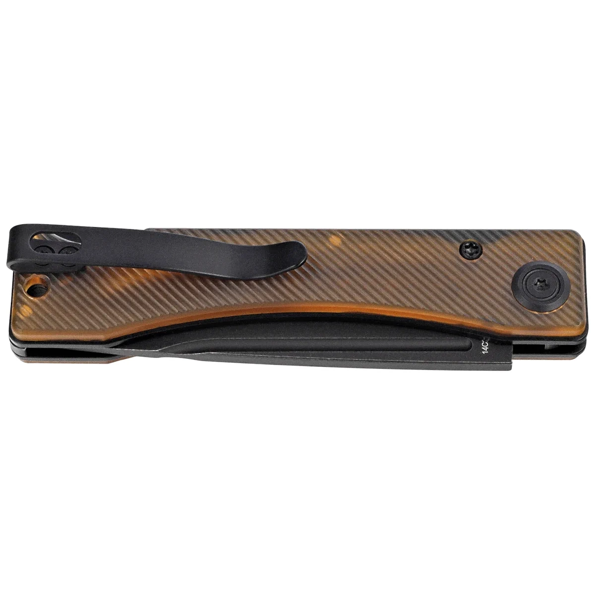 Handle - grips made of Ultem™ composite, a material that is extremely mechanically durable and virtually completely resistant to weather and chemicals, textured for improved grip security, are screwed to the knife's steel frame. The massive backspacer to which the grips are attached guarantees the rigidity and strength of the entire structure. The simple, solid construction gives the assurance of many years of use. The pivot axis is decorated with a stylized manufacturer's logo. A two-position (right/left) metal deep-carry clip allows you to carry the knife discreetly in your pocket in tip-up position (blade tip up). Under the clip a lanyard hole, a hole for threading a safety or decorative cord.