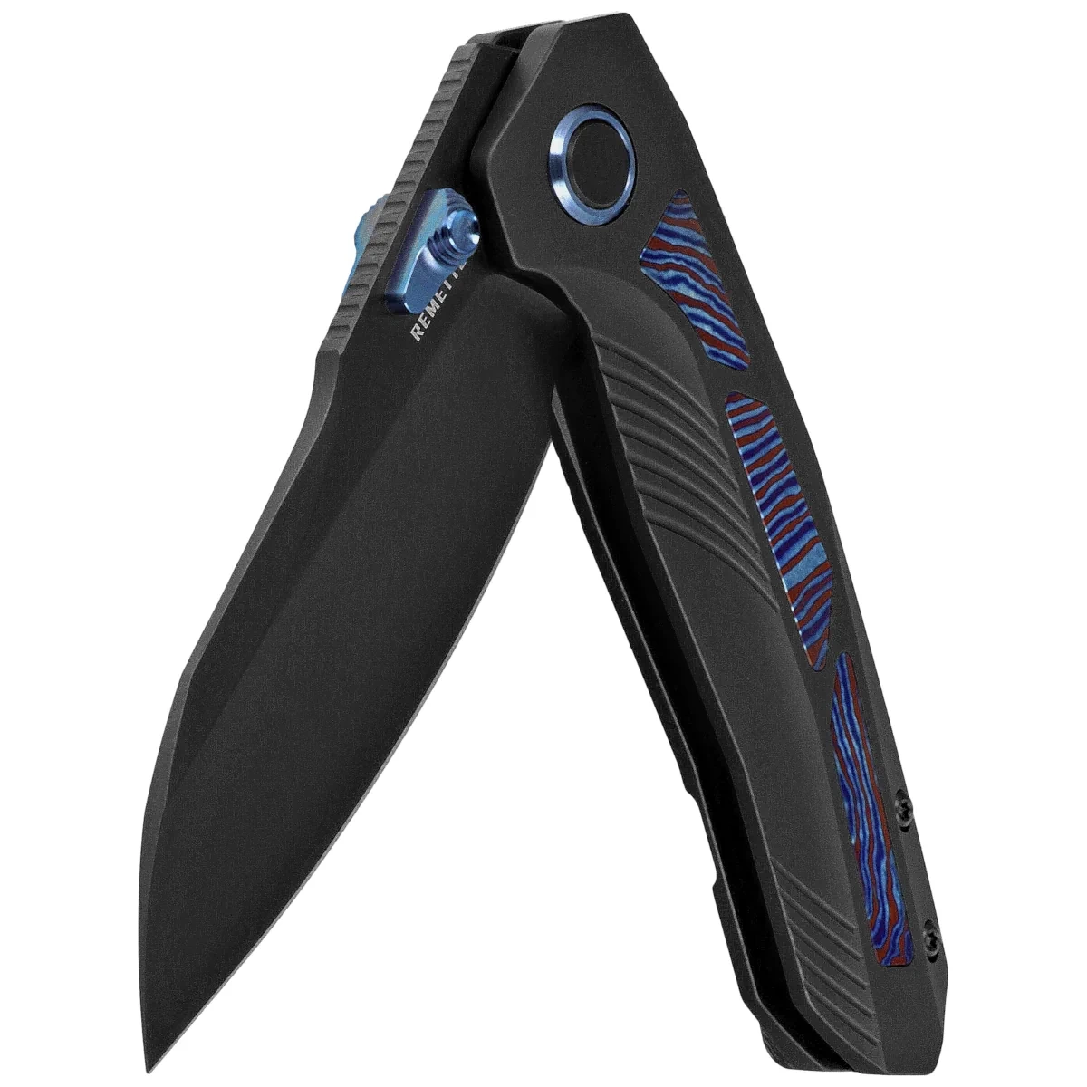 Handle - is a thick piece of titanium 6AL4V also covered with black DLC coating, contouring of the covers eliminates sharp edges. On both sides there is an inlay (insert) made of Timascus. Only a few companies are able to make the Handle with such incredible accuracy! The grips are joined together using a titanium backspacer. The right-side, single-position deep carry clip, also from Timascus, allows you to carry the knife discreetly in your pocket in tip-up (blade up) position. The pivot axis is decorated with a titanium rim (pivot collar cap).