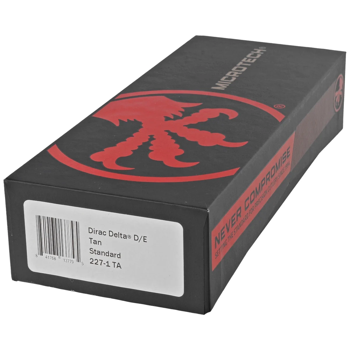 Dirac Delta D/E Tan Aluminum, Black is an enlarged OTF automatic knife from the Dirac series. It operates in D/A mode and is equipped with a hellishly fast blade ejection mechanism. The slider button is on the side of the handle. 100% made and assembled in the USA. Designed by Anthony Marfione, knifemaker and owner of Microtech Knives.