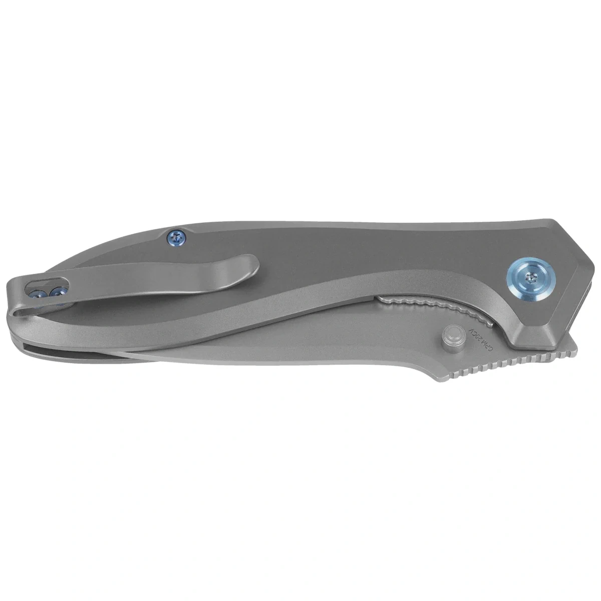 - Ruckus Gray Titanium, Beadblasted, compact EDC folder. Functional drop point blade made of high-quality CPM 20CV steel, comfortable handle made of robust titanium. Can be opened with a pin in the clip or front flipper. Excellent price-performance ratio!