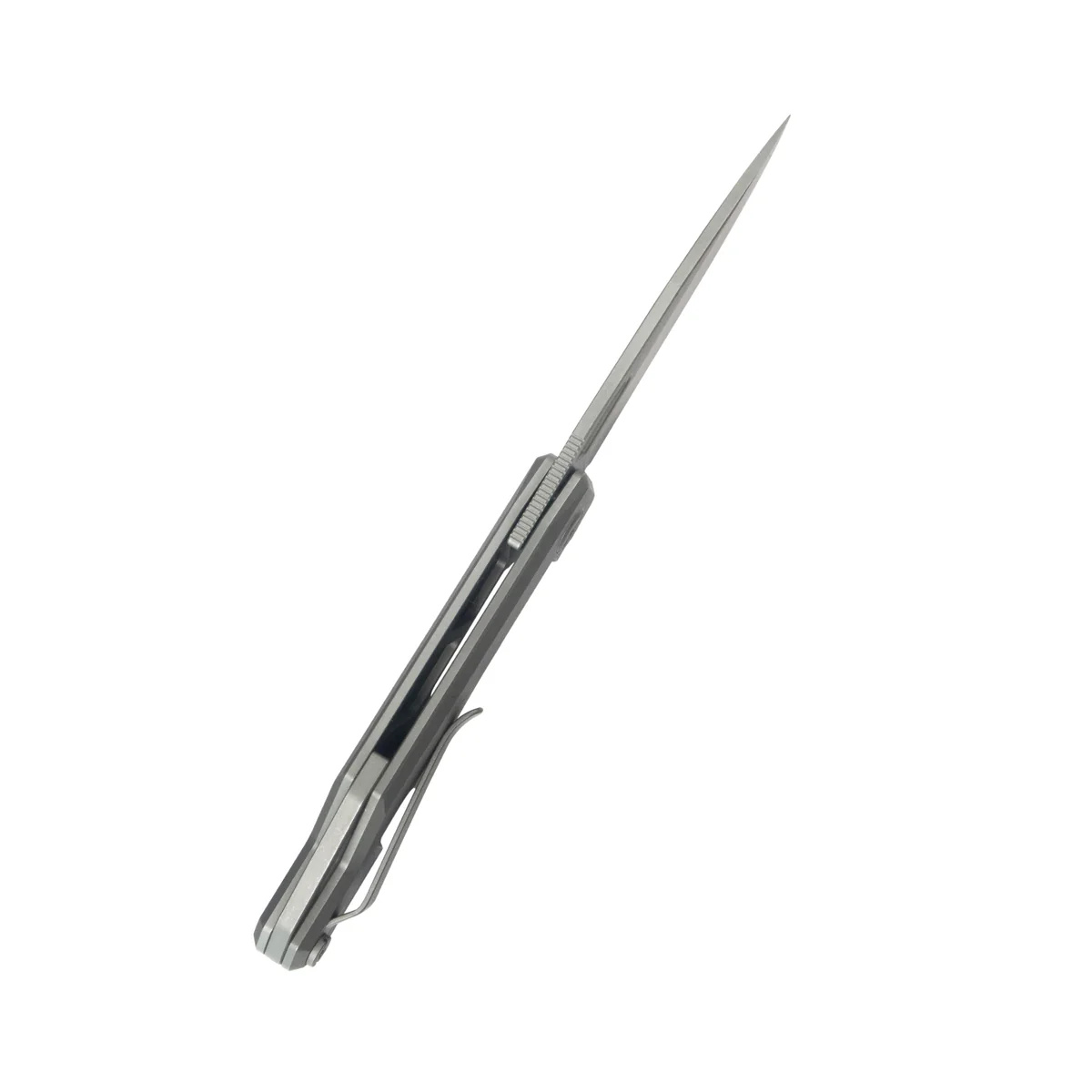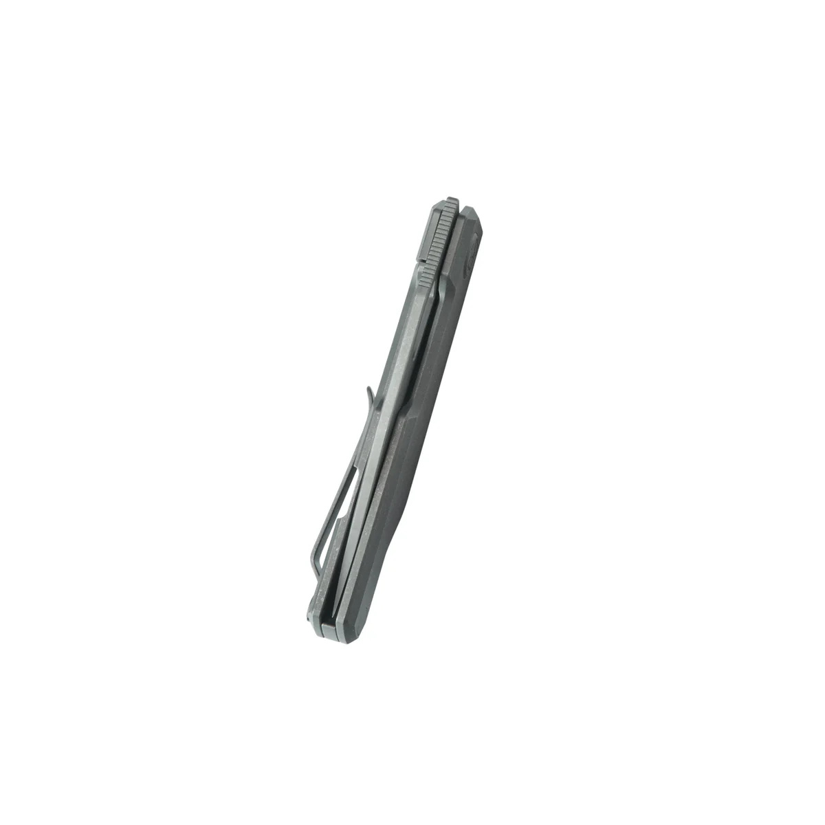 Handle - solid titanium 6AL4V, beveled edges of the covers eliminate sharp edges. The slightly rough texture of the handle ensures that the knife does not slip in the hand during use. The whole is screwed to a solid backspacer, also made of titanium. The pivot axis is decorated with a titanium cap (Pivot Cap). The forefinger groove improves the grip. The single-position (right) titanium deep carry clip allows you to carry the knife discreetly in your pocket in a tip-up position. There is a hole in the upper part of the backspacer for a safety or decorative cord.