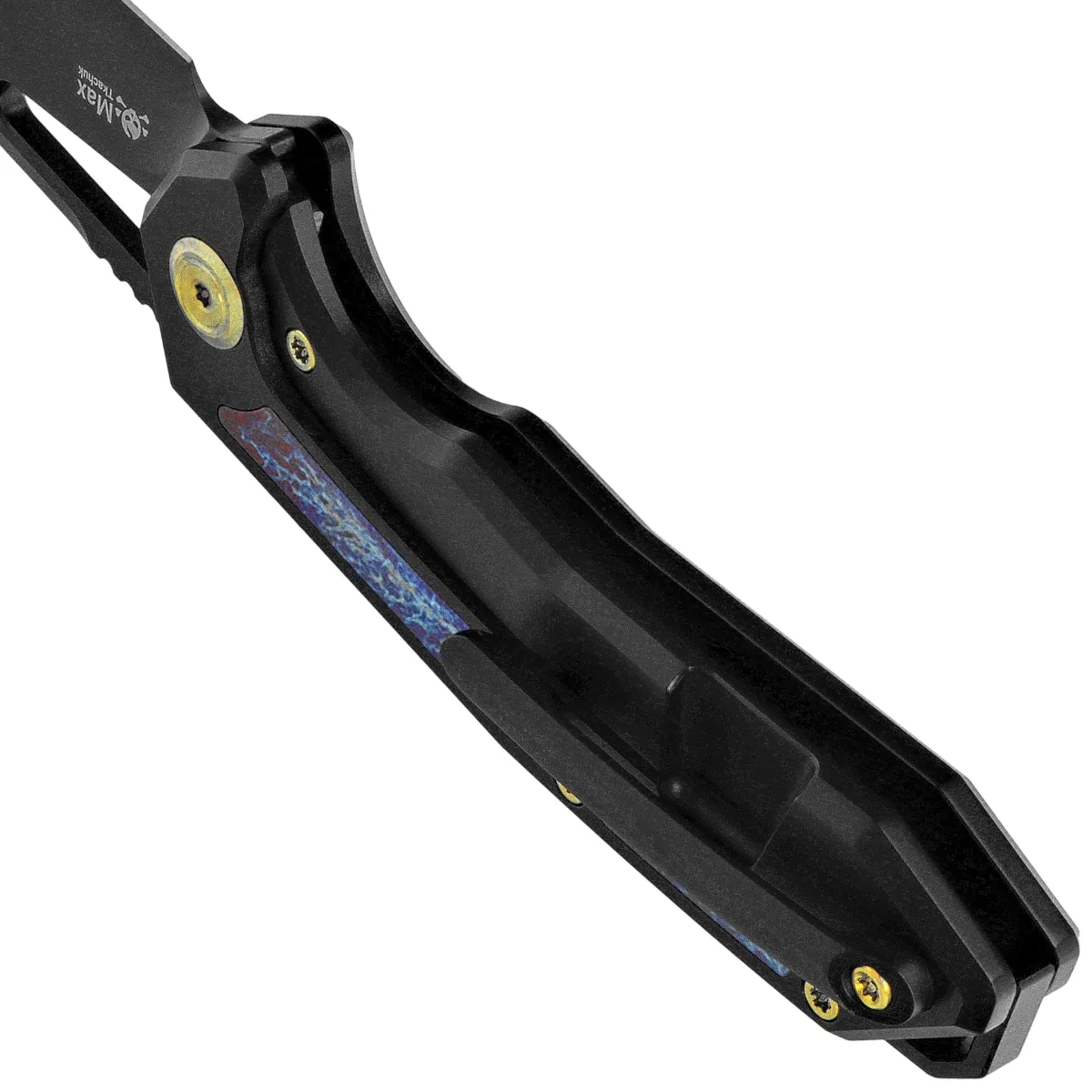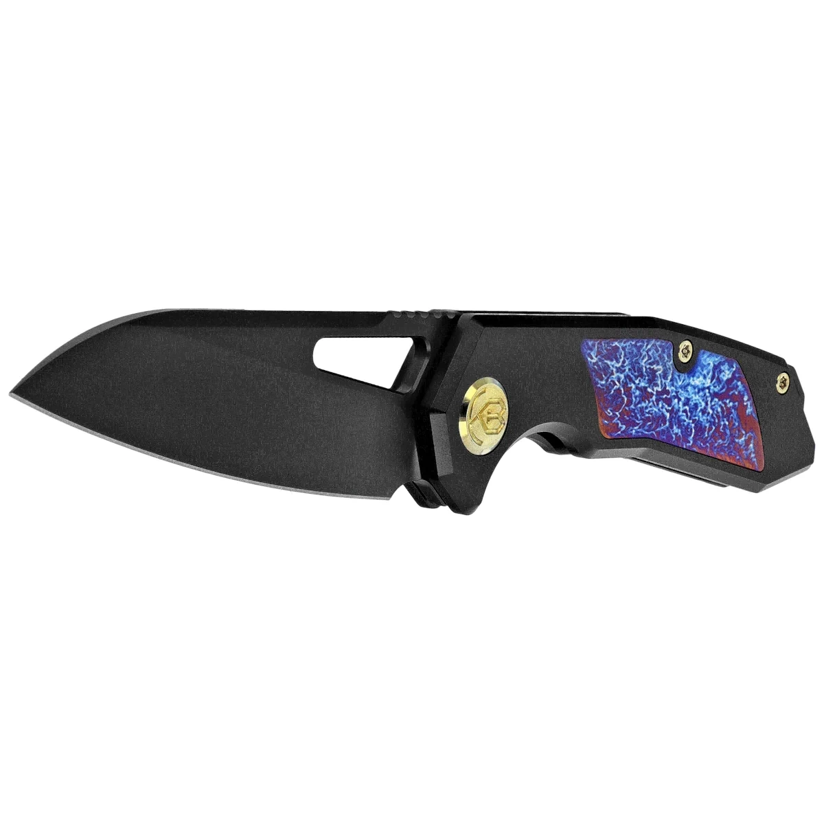 Vagrant Black Titanium/Timascus, Black DLC high-end EDC folder designed by Maksim Tkachuk. Every detail has been refined with the utmost precision, combining aesthetics with reliability. The blade is made of well-developed CPM S35VN steel, which is characterized by excellent abrasion resistance and an impressively long edge retention. Titanium alloy handle with Tomascus inlays ensures unparalleled strength and light weight. Sandblasted surface gives a subtle, matte texture for increased grip. Ergonomic design adapts to the hand, guaranteeing comfort even during prolonged use. The opening mechanism based on ball bearings and a hole in the handle allows for instant blade deployment. Frame lock guarantees maximum safety and stability during use. Vagrant is a reliable companion for everyday challenges. Sophisticated, solid, and yet subtly elegant.