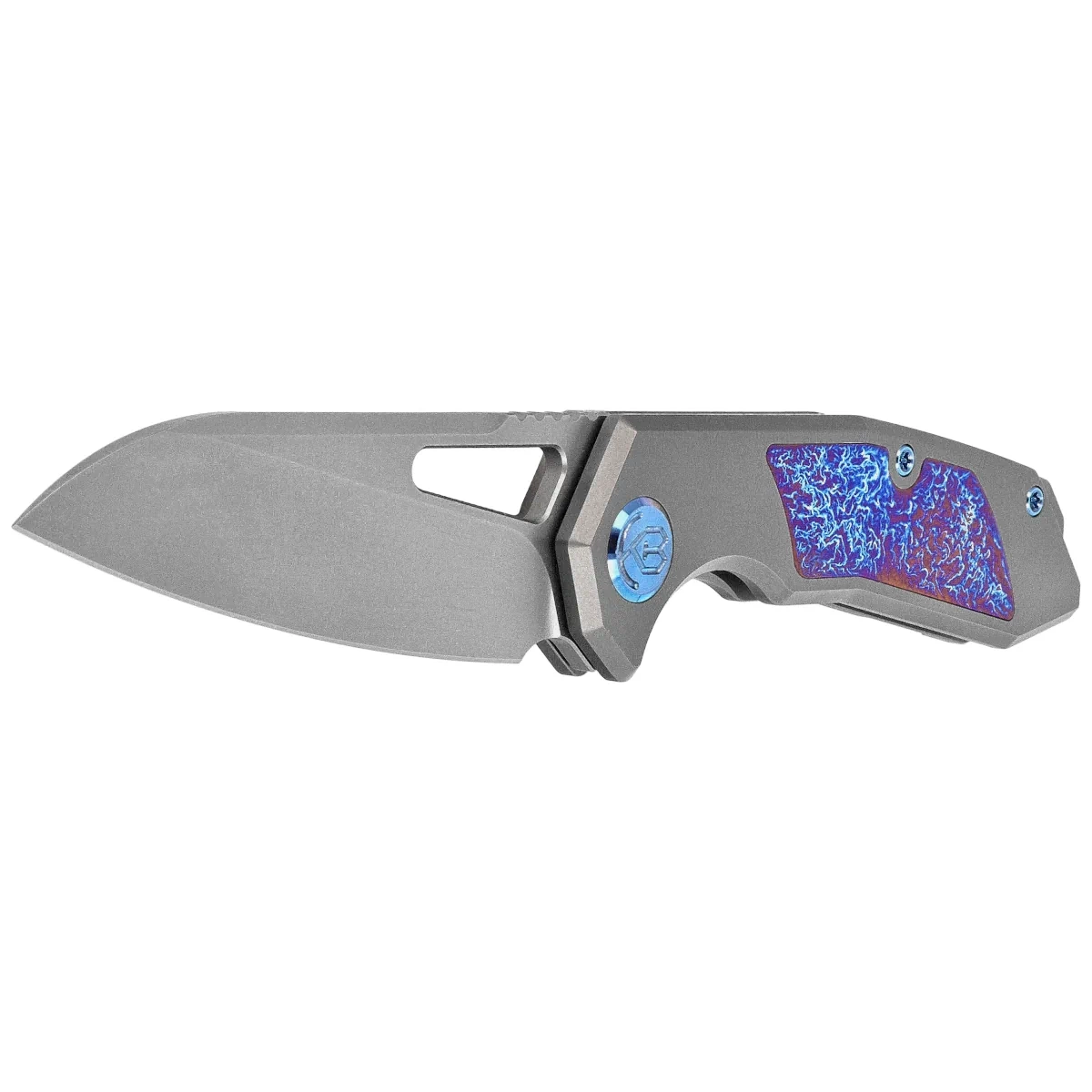 Vagrant Grey Titanium/Timascus, Beadblasted high-end EDC folder designed by Maksim Tkachuk. Every detail has been refined with the utmost precision, combining aesthetics with reliability. The blade made of well-developed CPM S35VN steel is characterized by excellent abrasion resistance and impressively long sharpness retention. Titanium alloy handle with Tomascus inlays ensures unparalleled strength and light weight. Sandblasted surface gives a subtle, matte texture for increased grip. Ergonomic design adapts to the hand, guaranteeing comfort even during prolonged use. The opening mechanism based on ball bearings and a hole in the handle allows for instant blade deployment. Frame lock guarantees maximum safety and stability during use. Vagrant is a reliable companion for everyday challenges. Sophisticated, solid, and yet subtly elegant.
