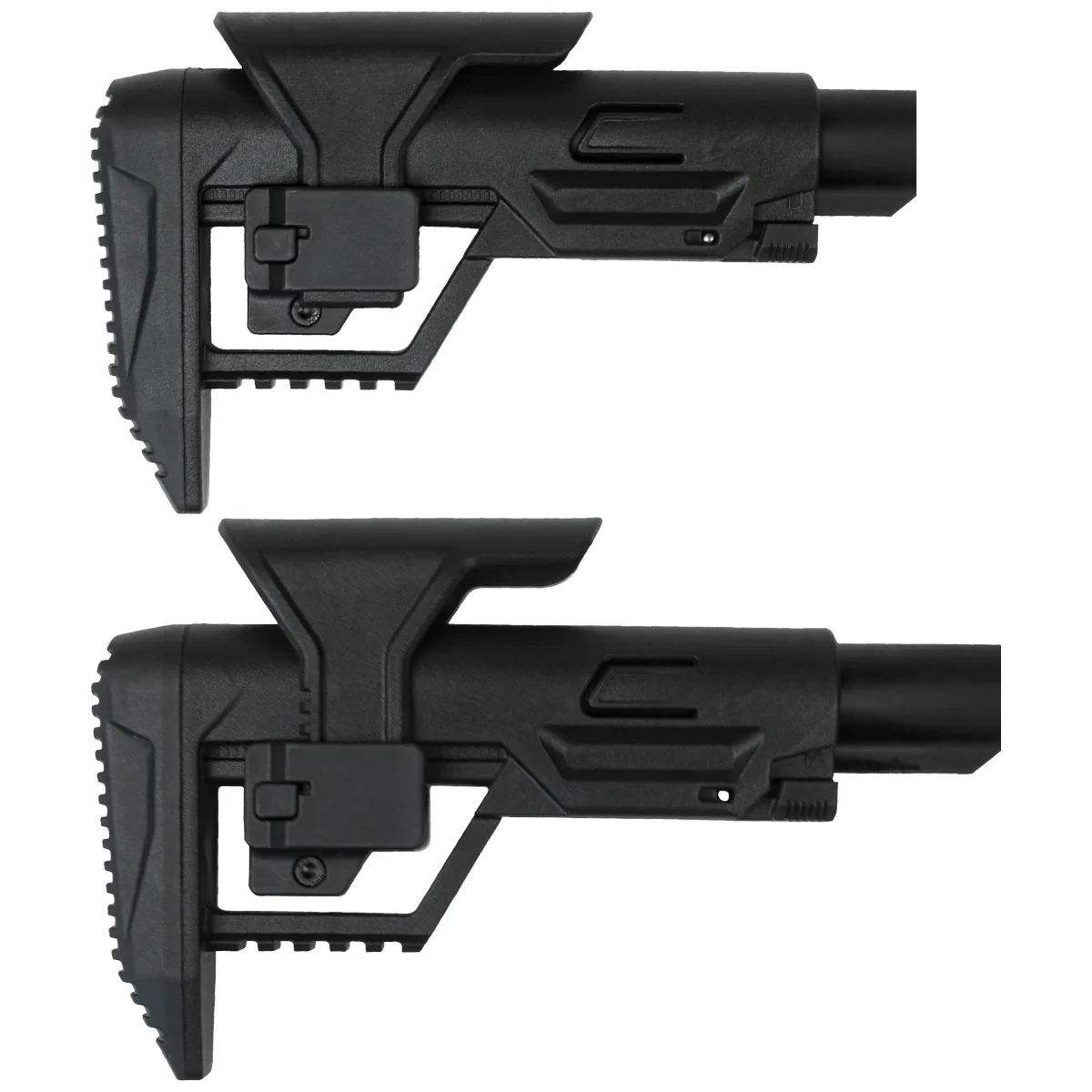 Stock – a compact, tactical design featuring a comfortable pistol grip and an AR-style telescopic stock with an adjustable cheekpiece. The stock is fitted with a rubber butt pad that can be adjusted vertically and horizontally. Equipped with sling swivel studs for a carrying strap and a compartment for a spare magazine. The checkered pattern and ergonomic grooves provide a firm grip on the rifle. The stock is made of durable polymer.