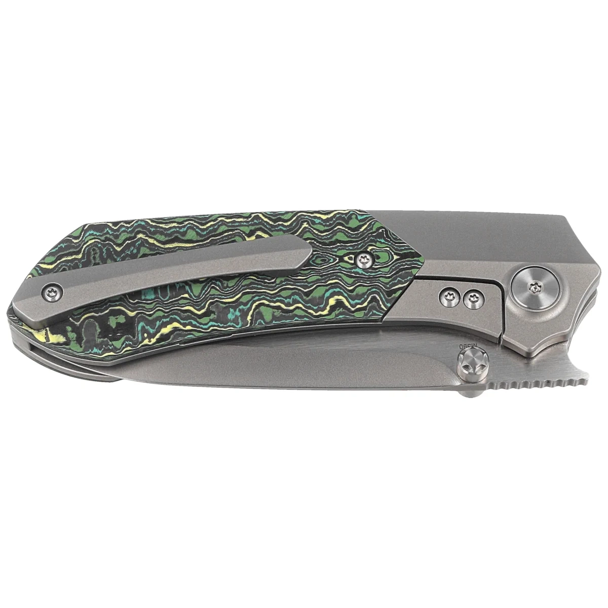 Handle - 6AL4V titanium bolsters, Toxic Storm Carbon Fiber composite handle made of virtually indestructible material, resistant to weather conditions, chemicals and mechanical damage. The beveled edges of the covers eliminate sharp edges. The grips are screwed to a solid titanium backspacer, ensuring that the desired stiffness of the entire structure is maintained. On the left side, there is a wide Button Lock, placed in a recess to avoid accidental opening. The The single-position (right) titanium deep carry clip allows you to carry the knife discreetly in your pocket in a tip-up position (with the tip of the blade up).