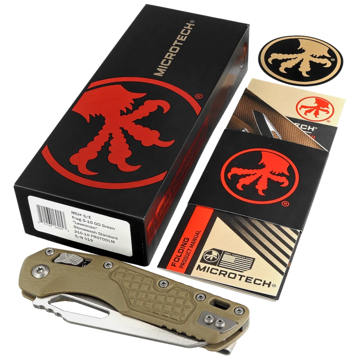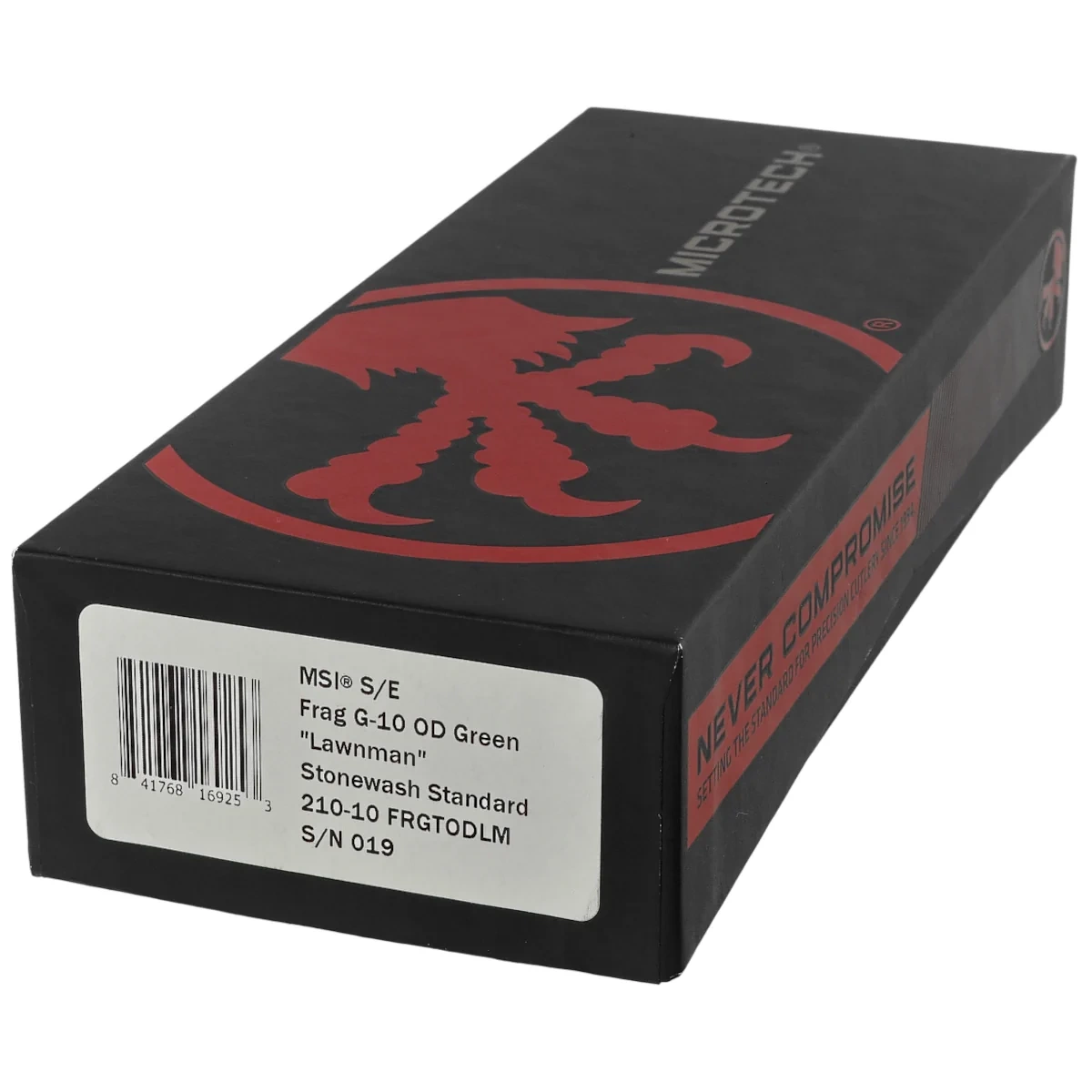 MSI S/E Ram-Lok Lawnman OD Green Frag G10, Stonewashed special edition folding knife that combines strength, durability and elegance. Its blade is made of the excellent M390MK steel, which is the result of a collaboration between two renowned companies - Microtech and Böhler. This steel is known for its exceptional durability and long-lasting sharpness, making this knife ready for any challenge. The intuitive RAM-Lok ensures safety during use. This innovative lock is easy to use and ensures ease of use for both right- and left-handed people. The handle of the knife is made of G10 composite, durable and ergonomic. Its shape has been designed to fit perfectly in the hand, ensuring comfort even during prolonged use. This knife is not only a tool, but also a work of applied art. Its designer, Anthony Marfione, founder and owner of Microtech, has taken care of every detail. From the elegant black finish to the satin details, this knife is both beautiful and practical. Whether you are looking for a reliable tool or an elegant accessory, MSI (Microtech Standard Issue) knife will meet your expectations.