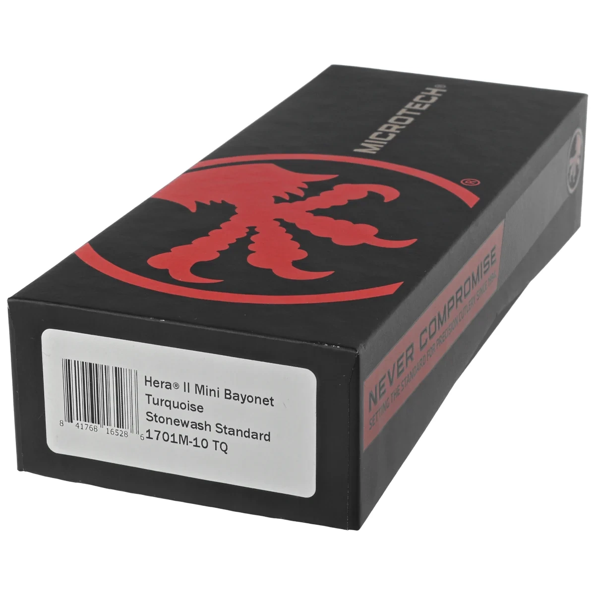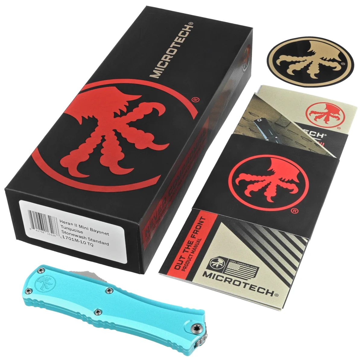 Hera 2 Mini Bayonet Turquoise Aluminum, Stonewashed A compact version of one of the best and most versatile OTF (Out The Front) automatic knives. Modeled on the iconic Troodon, it is an intermediate link between EDC and tactical models. This automatic knife with above-average durability works in D/A (Double Action) mode, utilizing a powerful opening mechanism. This model is characterized by excellent fit and finish. Designed by Anthony Marfione, knifemaker and owner of Microtech Knives.