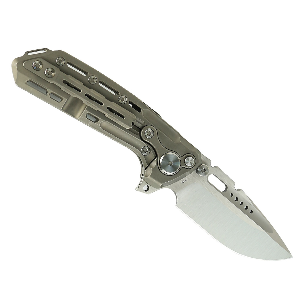 Handle - made of solid titanium 6AL4V, perfectly milled on CNC machines. The contouring of the covers eliminates sharp edges, and the openwork surface improves grip. Only a few companies are able to make a handle with such incredible accuracy! The grips are connected by a titanium backspacer. A single position titanium clip (right) allows the knife to be carried in a tip-up position. On the spine, a slider releases an additional lock in the form of two steel rollers located above the pivot axis. The lock also works when the knife is closed, preventing accidental opening. The protruding part of the backspacer can be used as an improvised ice pick, it also has a hole for a safety or decorative cord.