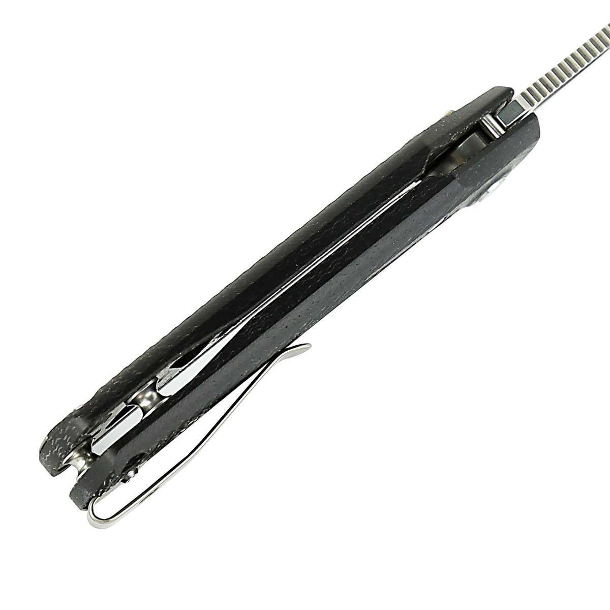 Handle - grips made of micarta, a virtually indestructible material that is resistant to weather, chemicals and mechanical damage. The beveled edges of the covers eliminate sharp edges and the characteristic surface texture improves grip. The open open-backed design without the typical backspacer, attached to each other with spacer sleeves, facilitates cleaning. The simple but solid construction guarantees many years of use. On the left side, there is a slider that prevents accidental release of the lock. Two-position (right/left) clip allows the knife to be carried in tip-up position with the tip of the blade facing upwards.