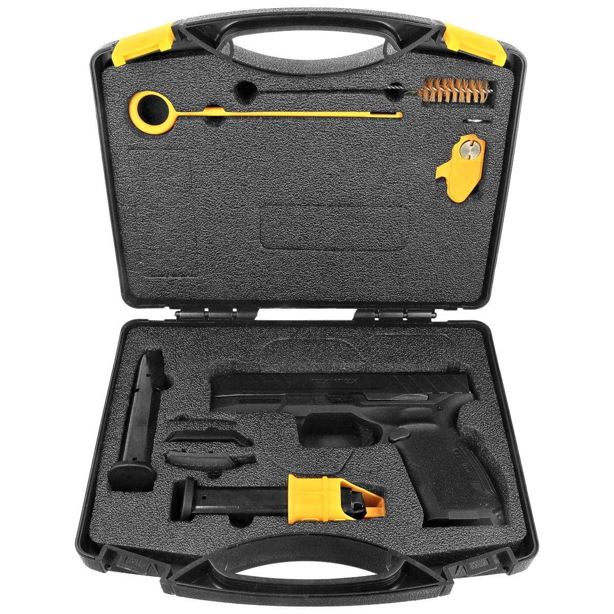 - Reximex TRX9 Black, semi-automatic pistol chambered in 9x19mm. Designed to meet the highest standards, this firearm will satisfy even the most demanding shooters. The set includes a hard case, cleaning rods, two magazines, two backstraps. Color: black.