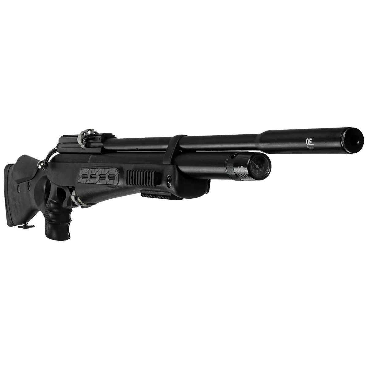 Barrel – Precision-rifled, 23" (585 mm) barrel by Hatsan Arms, topped with an integrated QE (QuietEnergy) suppressor that reduces muzzle report by up to 50%. This integrated design maintains optimal pellet velocity, unlike traditional add-on suppressors. Hatsan engineers also improved rifle balance with this integration. The barrel features a choked muzzle for enhanced accuracy. As one of the most critical components in any firearm or airgun, barrel quality is paramount to overall performance.