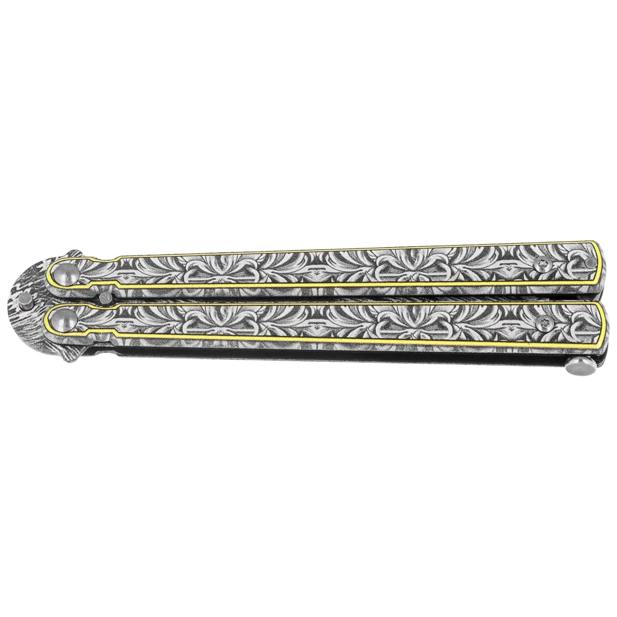 Classic Damask Stainless Steel, Damascus Pattern from Spanish brand Martinez Albainox is an aesthetically refined balisong with a design inspired by classic show knives. Thanks to the use of 3Cr13MoV stainless steel and ornamentation imitating the Damascus pattern, the knife attracts attention as a display item, but also works well for manipulation training. The compact design with symmetrical arms, balanced geometry and standard latch mechanism ensure secure blade guidance and safe use. The overall design is aimed at collectors and users who prefer classic design, subtle embellishments and simple mechanical reliability. A steel Handle covered with a pattern that corresponds with the Blade creates a consistent aesthetic, emphasizing the elegance and decorative character of the model. Classic Damask is for those who appreciate form, detail and utilitarian minimalism in metal.