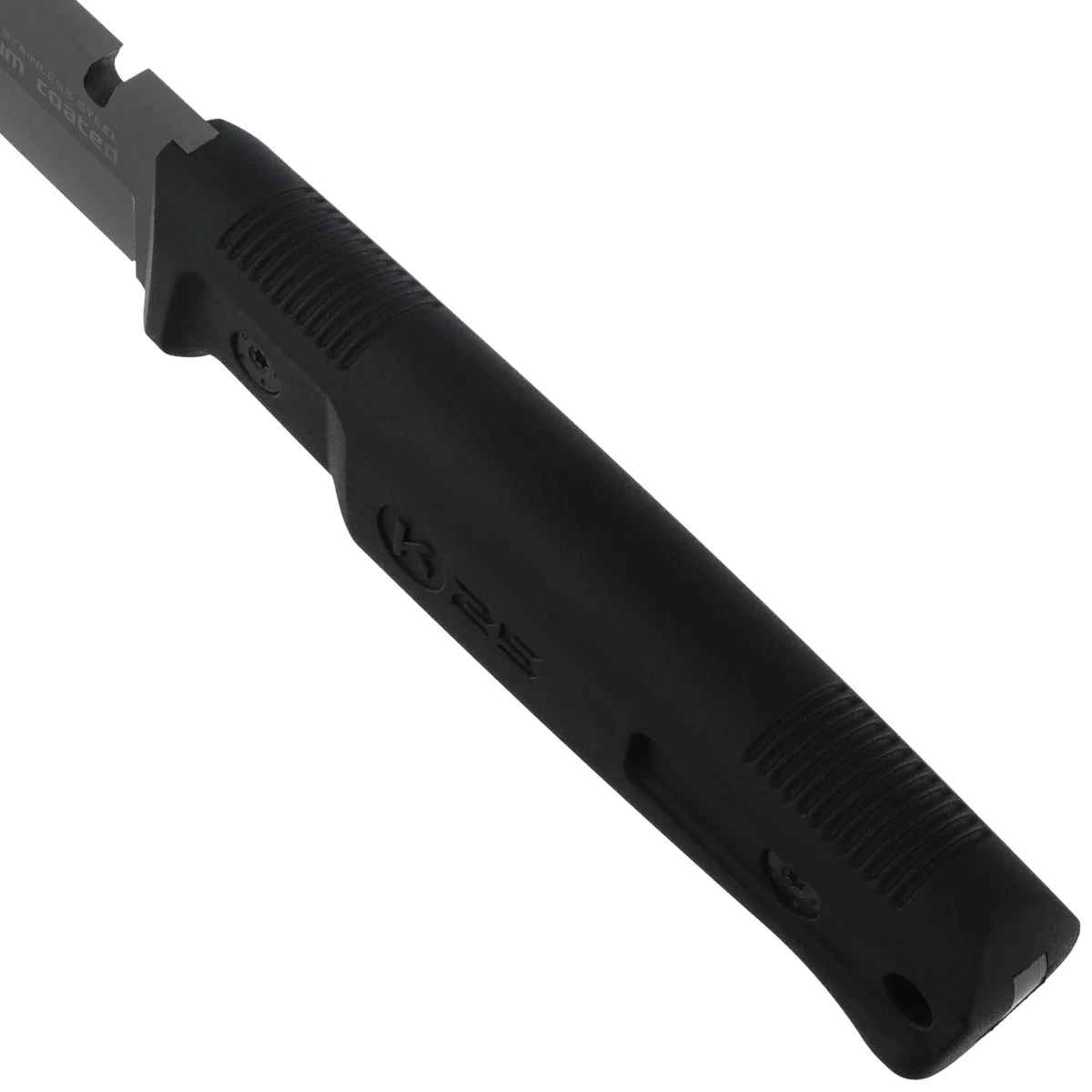 RK-32757 Black Rubber, Titanium-Coated from the K25 brand is a classic tactical knife designed for field use where reliability, ergonomics and material resistance are important. The fixed 4Cr13MoV stainless steel blade , coated with Black Titanium, offers increased protection against corrosion and reduces light reflections - a key aspect in tactical conditions. Thanks to its well-thought-out blade geometry and robust grind, the model performs well in both precision tasks and heavier field applications. The textured black rubber Handle provides a secure grip even in wet environments, and the sturdy construction translates into increased rigidity and resilience of the entire tool. The balance and anatomical shape of the grip promote comfort during prolonged use. The whole is complemented by a black nylon sheath, offering quick access and safe carrying. This is a proposition for people who need a rugged outdoor knife with a distinctly tactical character - ready to operate in any field conditions.