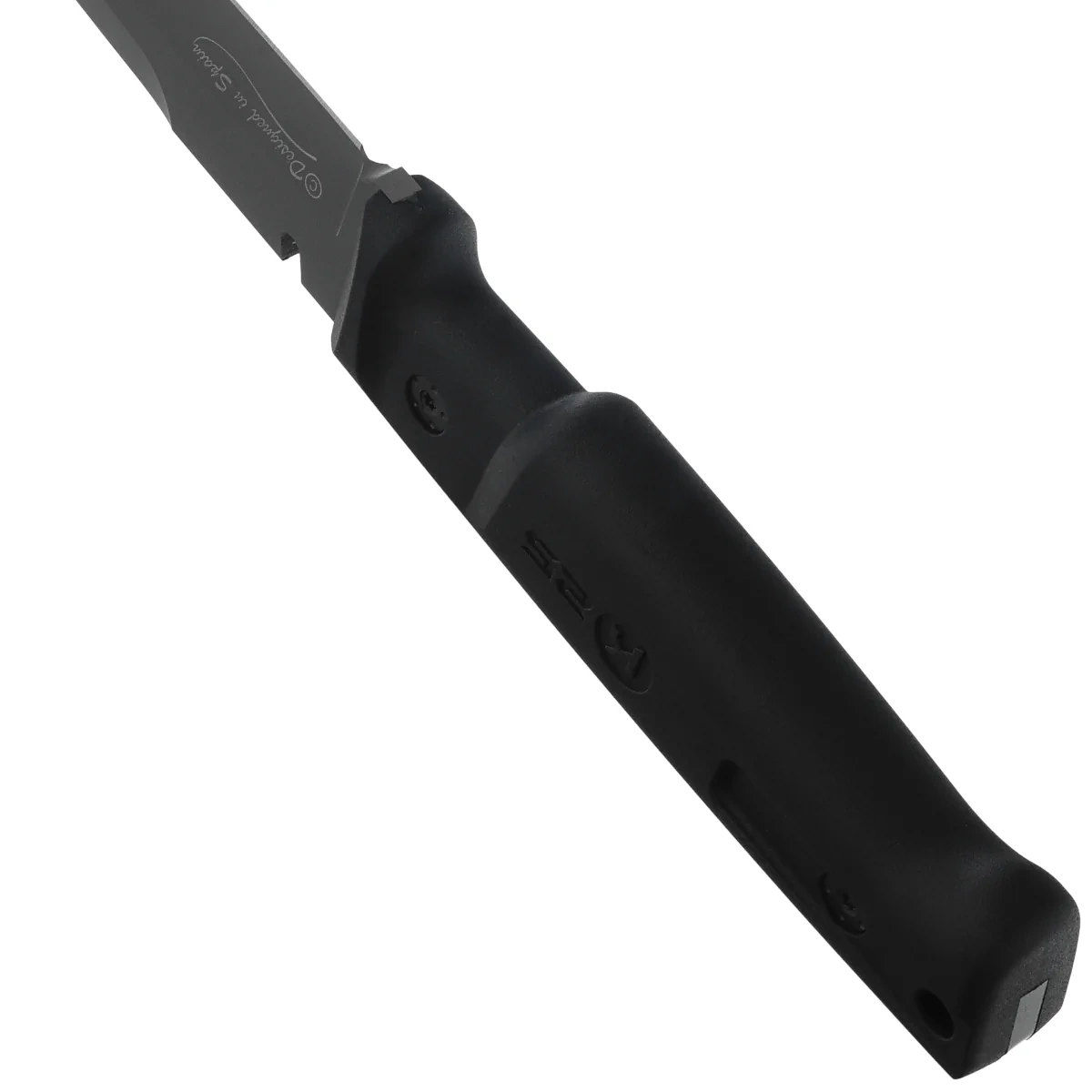 Handle - made of black rubber with a textured surface, which guarantees a high level of grip regardless of weather conditions. Ergonomic contouring and light finger undercuts ensure natural hand positioning and confident handling of the knife even when wearing gloves. The sturdy construction increases resistance to overloading and eliminates structural weaknesses. It comes with a sturdy sheath made of black nylon, designed to be worn comfortably at the belt. This is a reliable tool for professionals, servants and outdoor enthusiasts.
